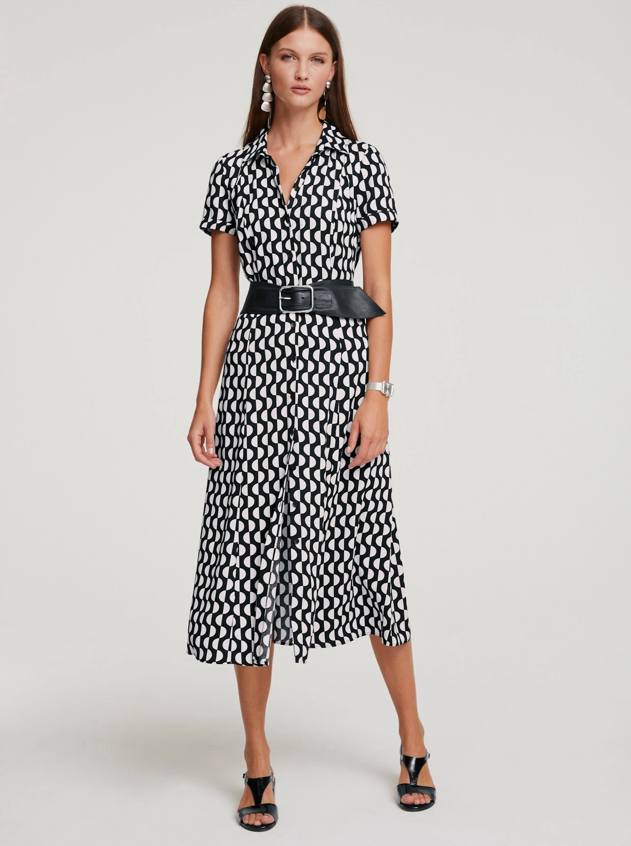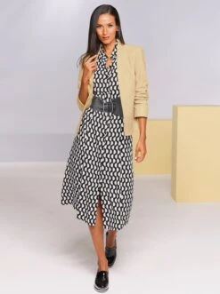 Druck-Kleid Unkomplizierter Hemdblusen-Style mit modernem Print-Dessin. Locker figurumspielend, mit durchgehender Knopfleiste und Kurzarm. Inklusive passendem Bindegürtel.