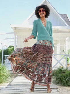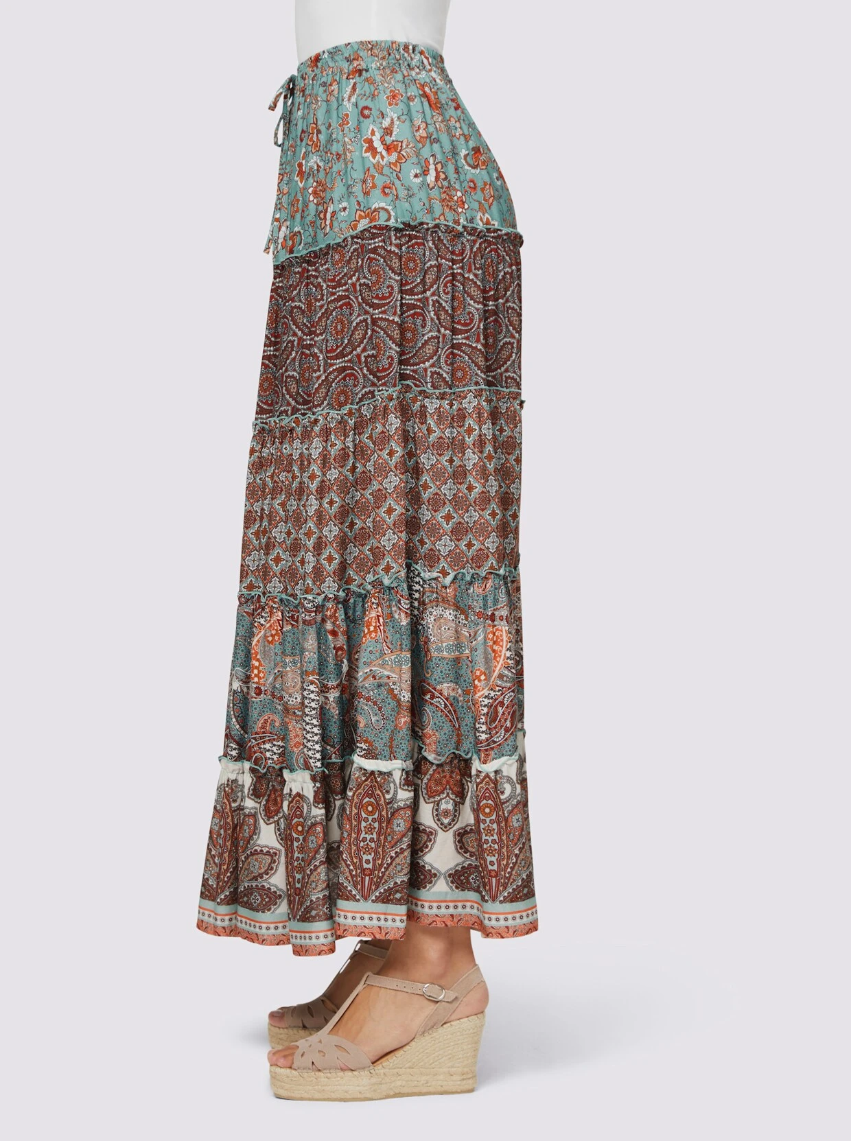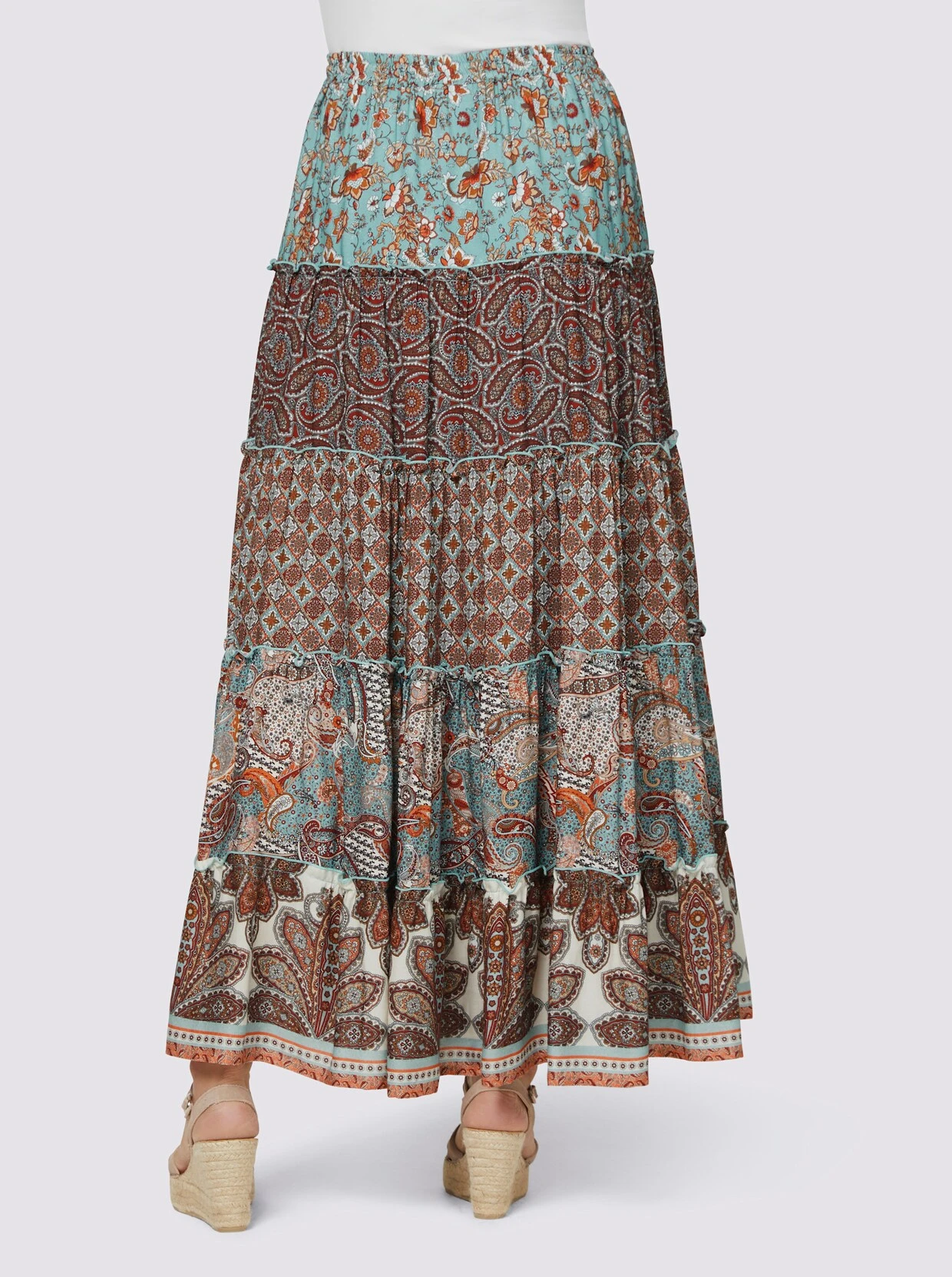 Druck-Rock Stufenrock im topaktuellem Mustermix. Weit schwingende Bahnenform. Rundumdehnbund mit Bindeband.