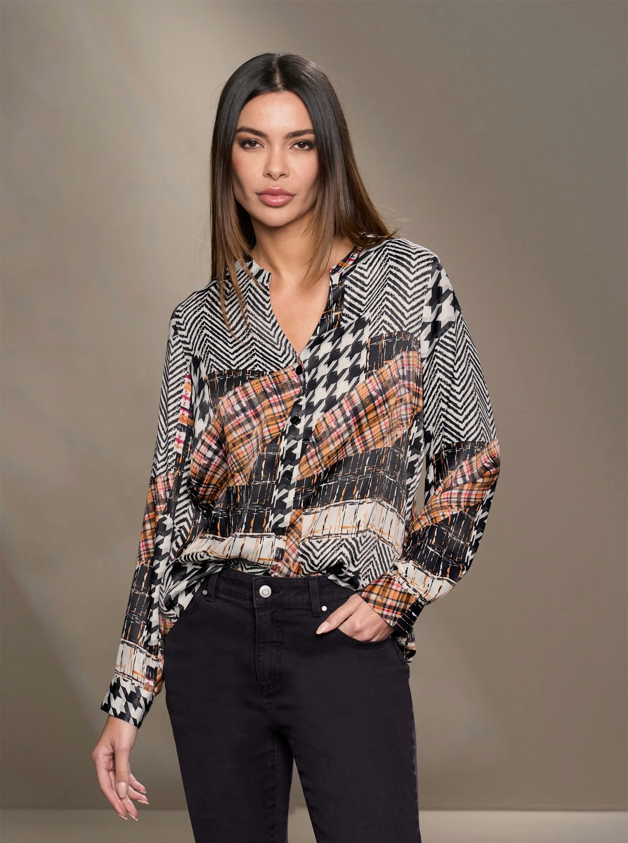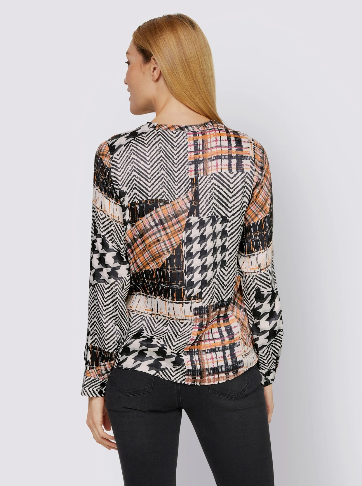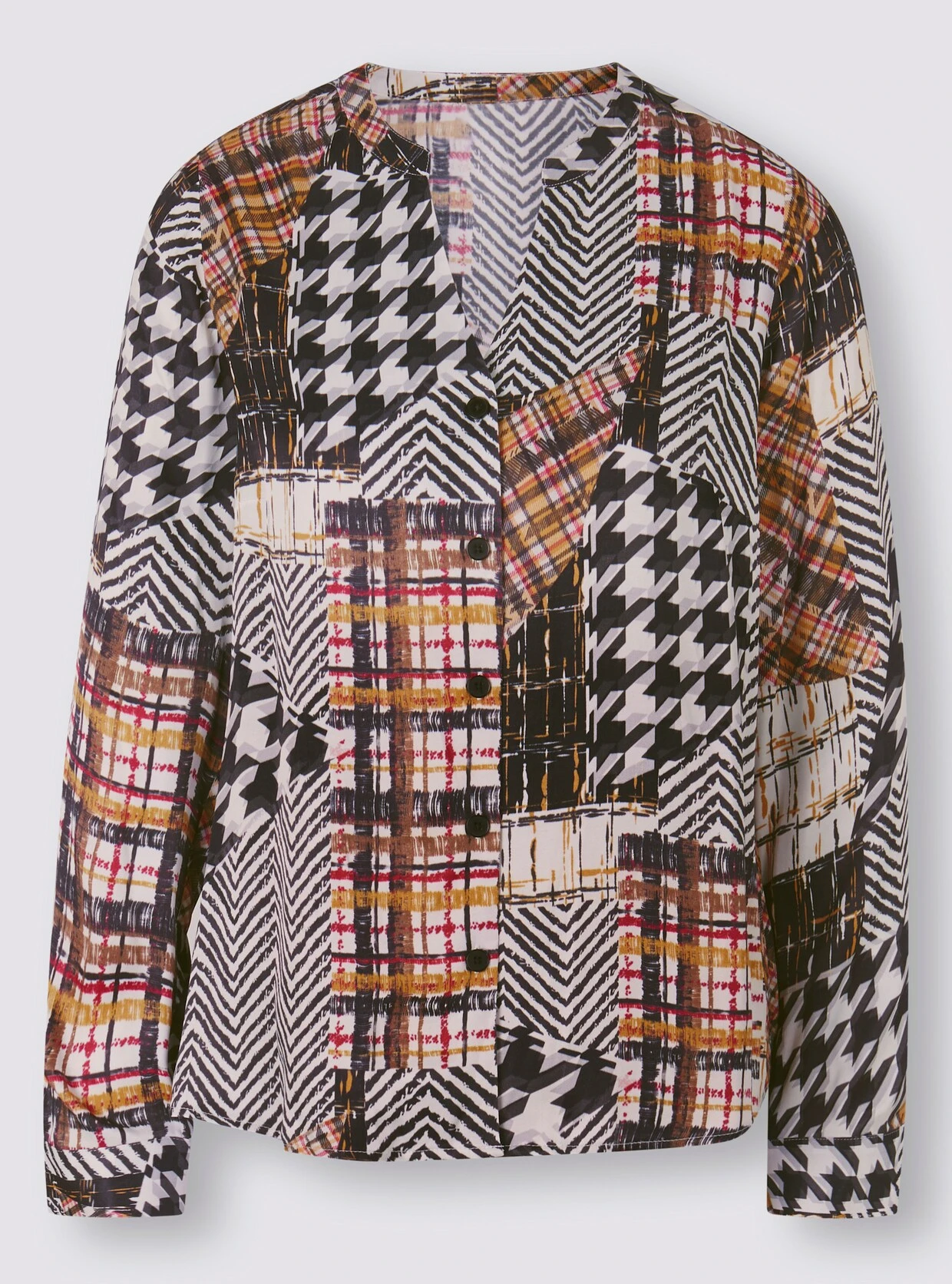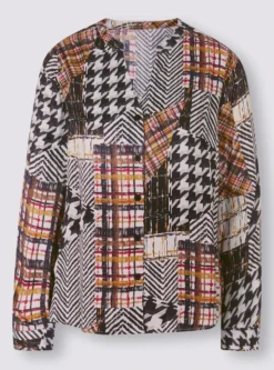 Druckbluse Edles Teil mit graphischem Patchwork-Druck und feinem Glanz. Rundhalsausschnitt mit kleinem V. Mit durchgehender Knopfleiste und Manschetten an den langen Ärmeln.