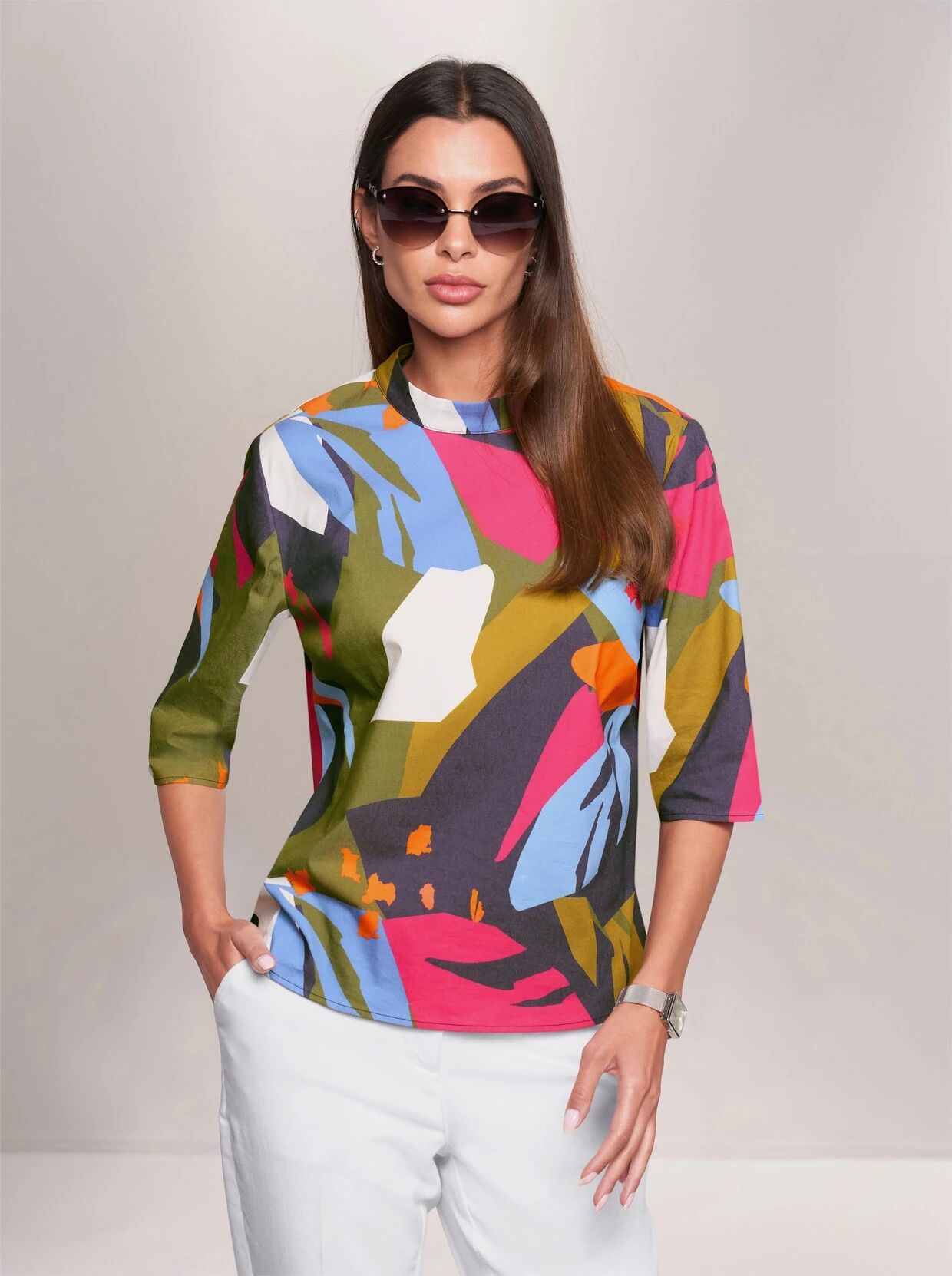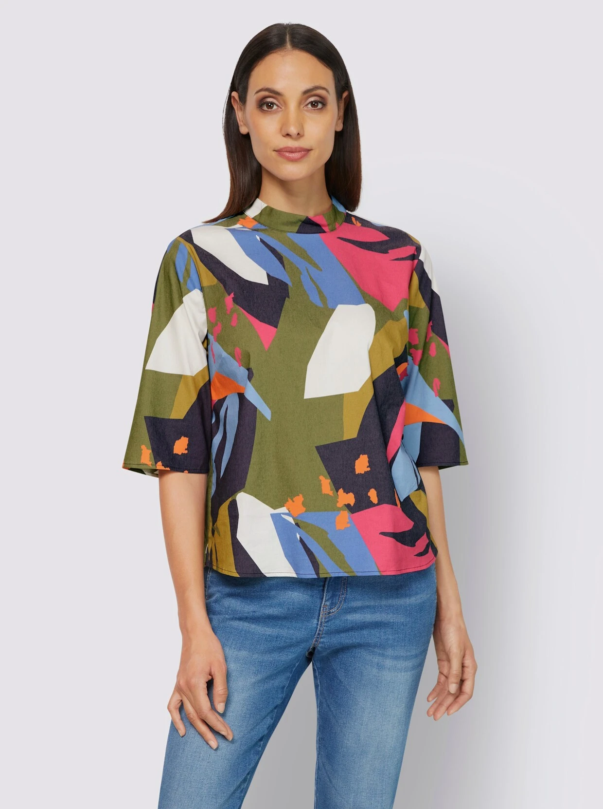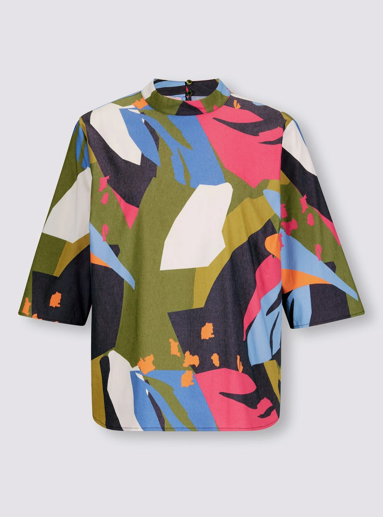 Druckbluse Farbenfroher Mustermix. Modischer Stehkragen, hinten mit Knopfverschluss und Schlitz. Mit etwas längerem Halbarm. Gerader Saum. Unterstützt die Initiative Cotton made in Africa.
