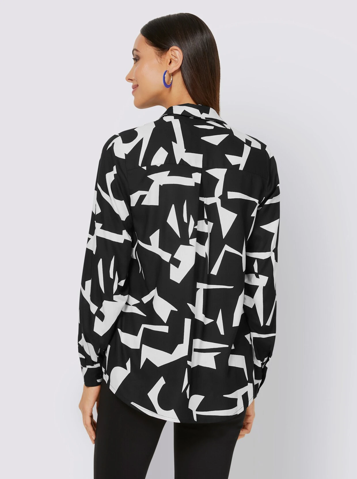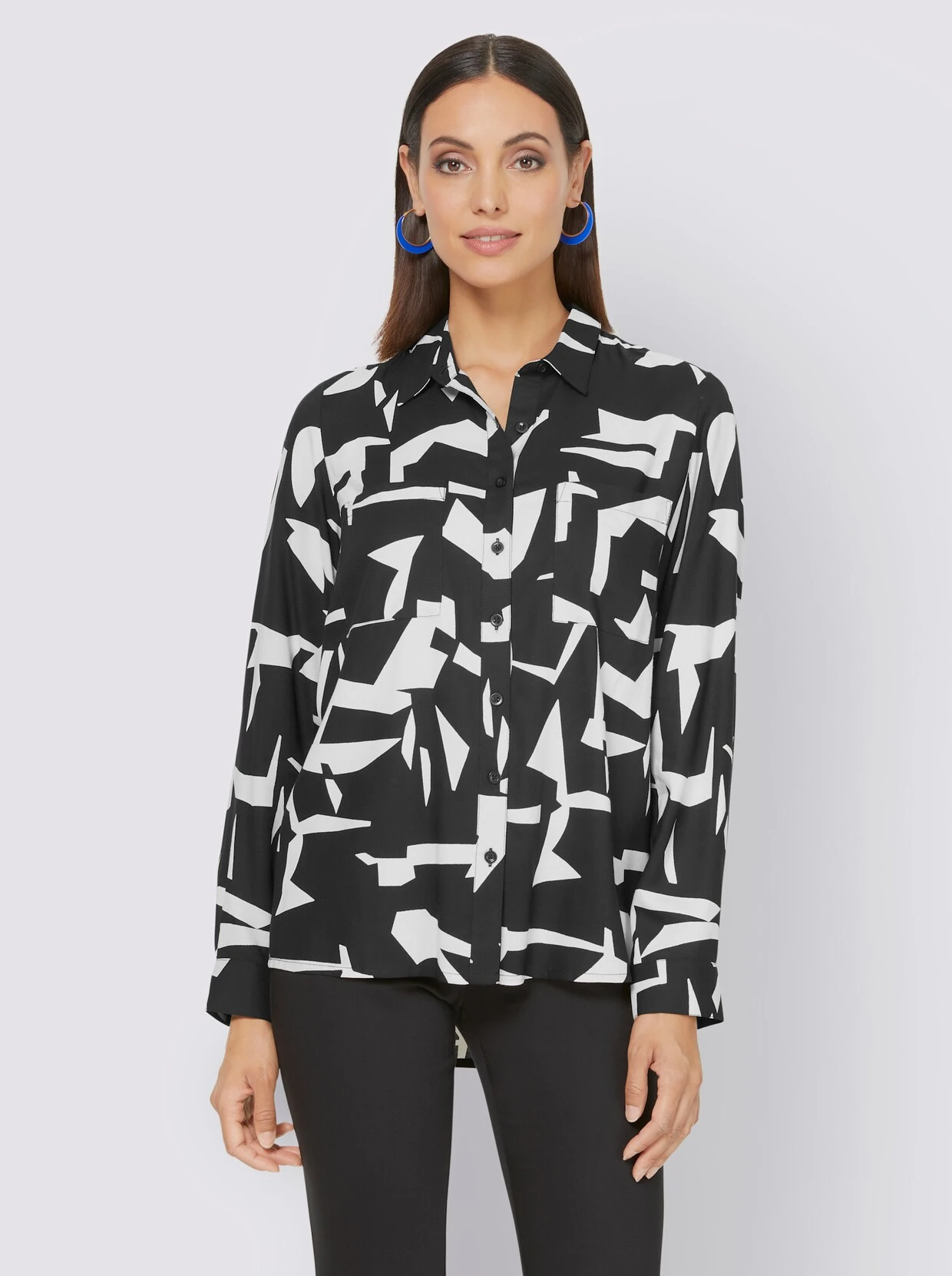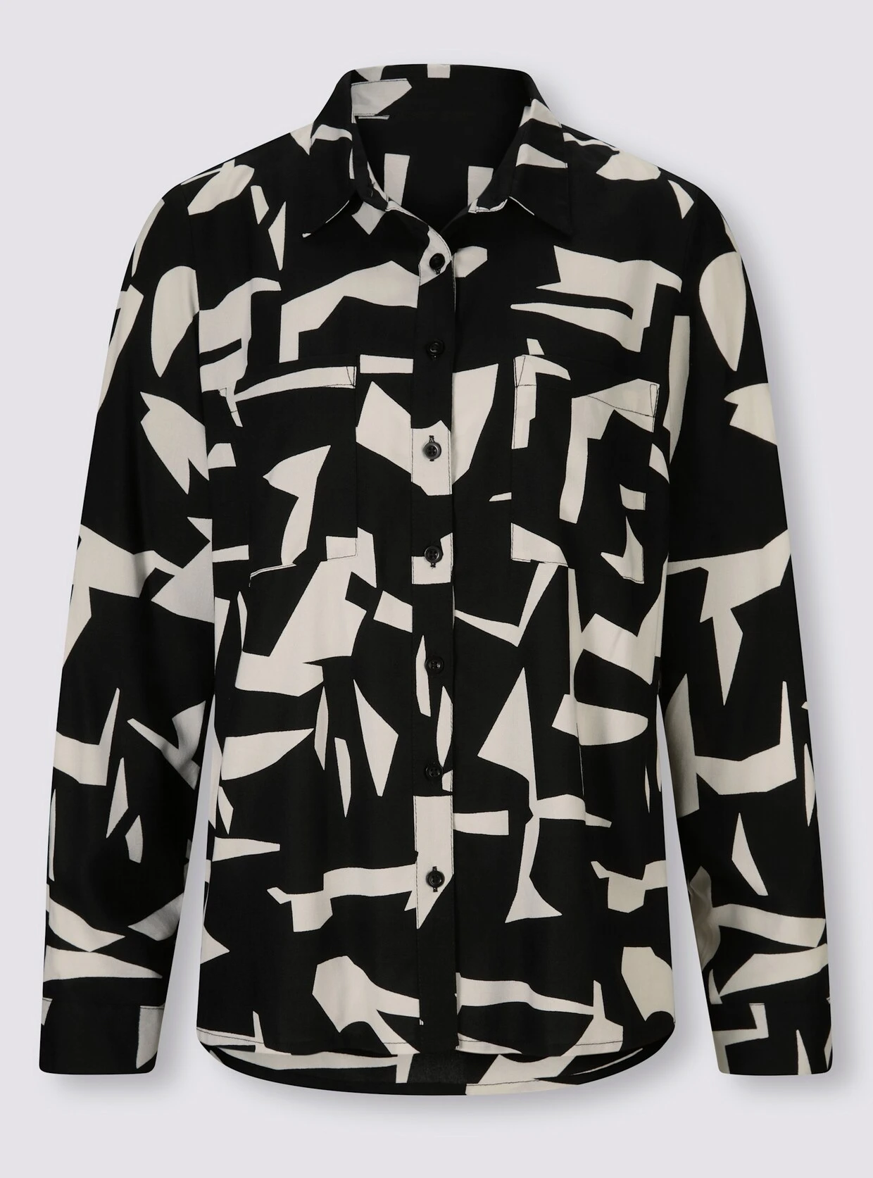 Druckbluse Mit extravagantem Print-Dessin auf fein fließender Qualität. Mit Hemdkragen, Knopfleiste, aufgesetzten Brusttaschen und gebogtem Saum. Knopfmanschetten am Langarm.