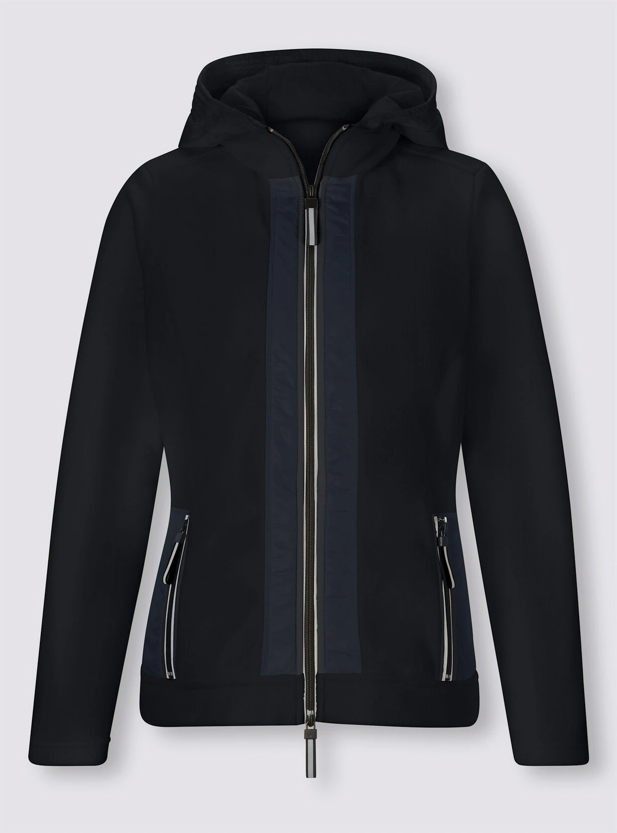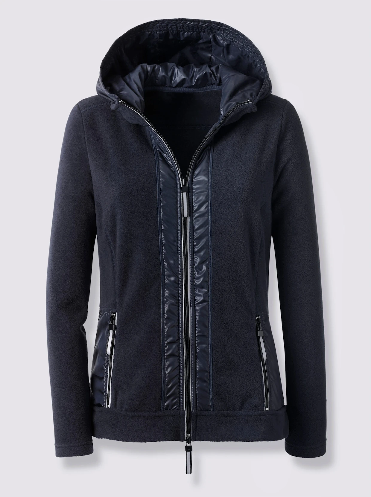 Fleece-Jacke Leicht kombinierbarer Kombi-Partner für den Übergang oder kühle Sommertage. Mit modernem Stehkragen und Kapuze. Kontrastfarbige Details. Mit 2-Wege-Reißverschluss und praktischen Reißverschlusstaschen.