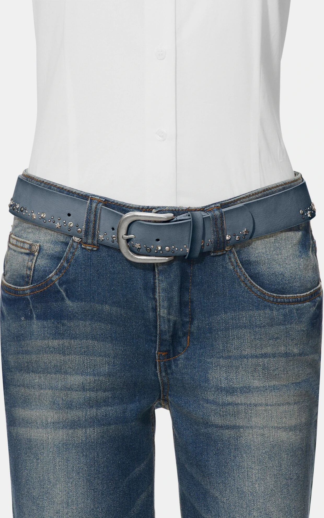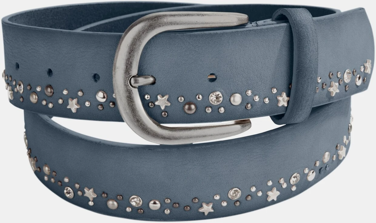 Gürtel In schlichter Form. Mix aus Rind-Spaltleder und Synthetik, mit trendigem Finish. Mit verschieden großen Nieten, Acrylsteinen und abgerundeter Metallschließe. Breite ca. 3,5 cm.