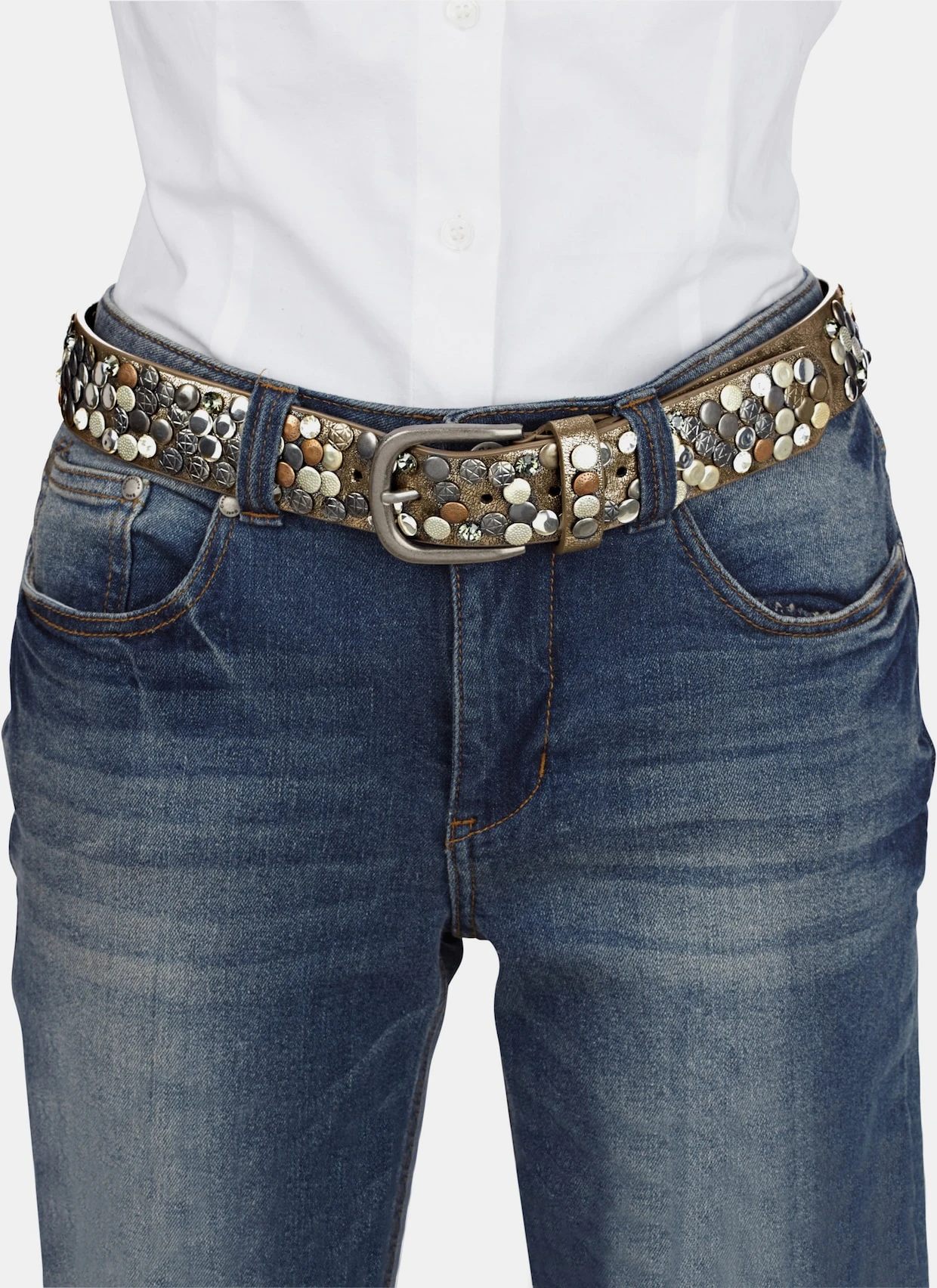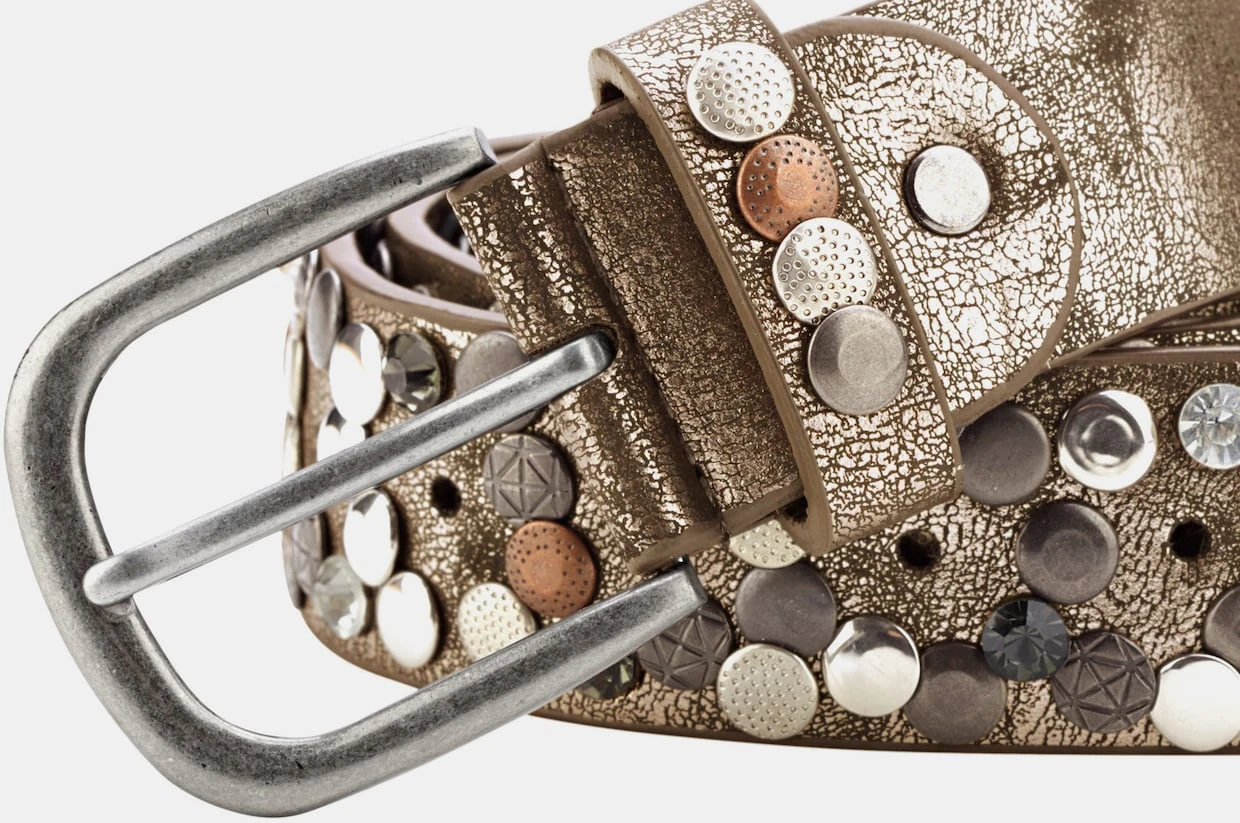 Gürtel Aus Rind-Spaltleder und Synthetik, mit dekorativen Metallnieten und Acrylsteinen. Abgerundete Metallschließe. Breite ca. 4 cm.