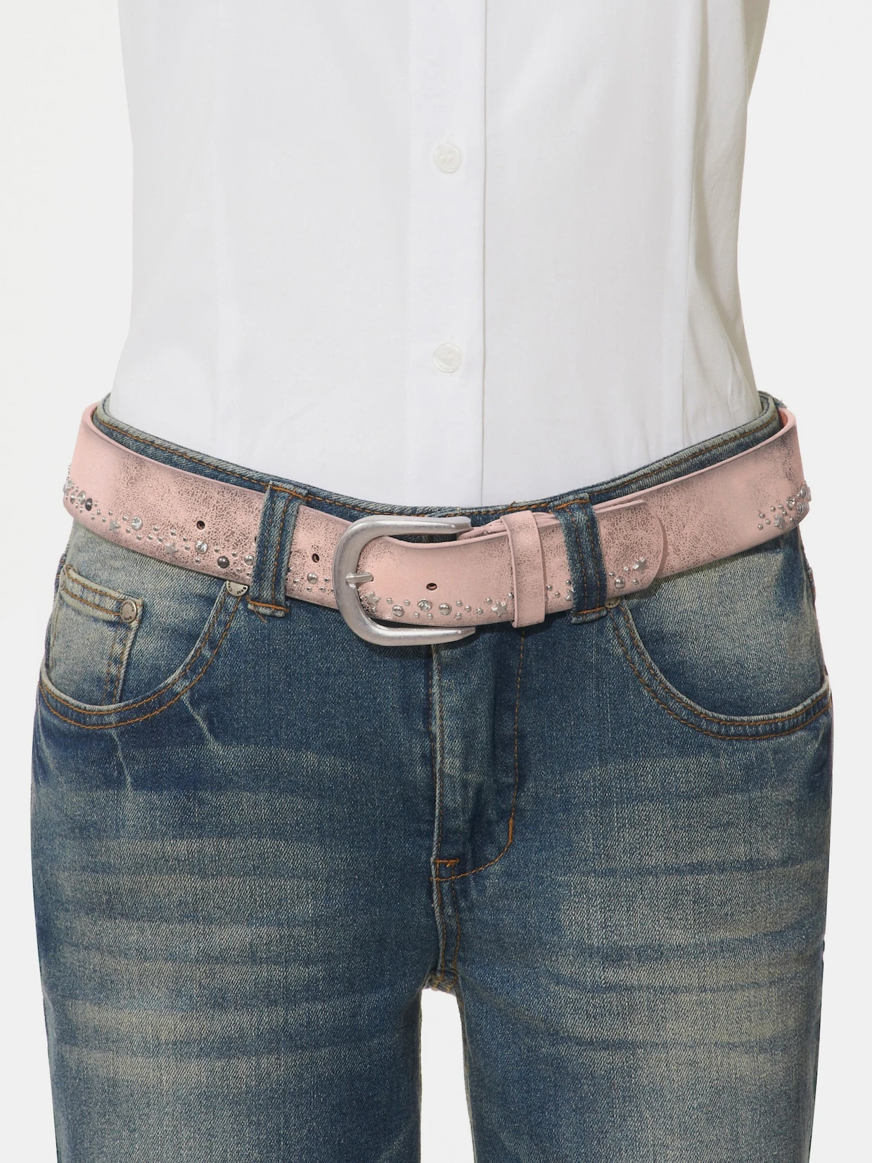 Gürtel In schlichter Form. Mix aus Rind-Spaltleder und Synthetik, mit trendigem Finish. Mit verschieden großen Nieten, Acrylsteinen und abgerundeter Metallschließe. Breite ca. 3,5 cm.
