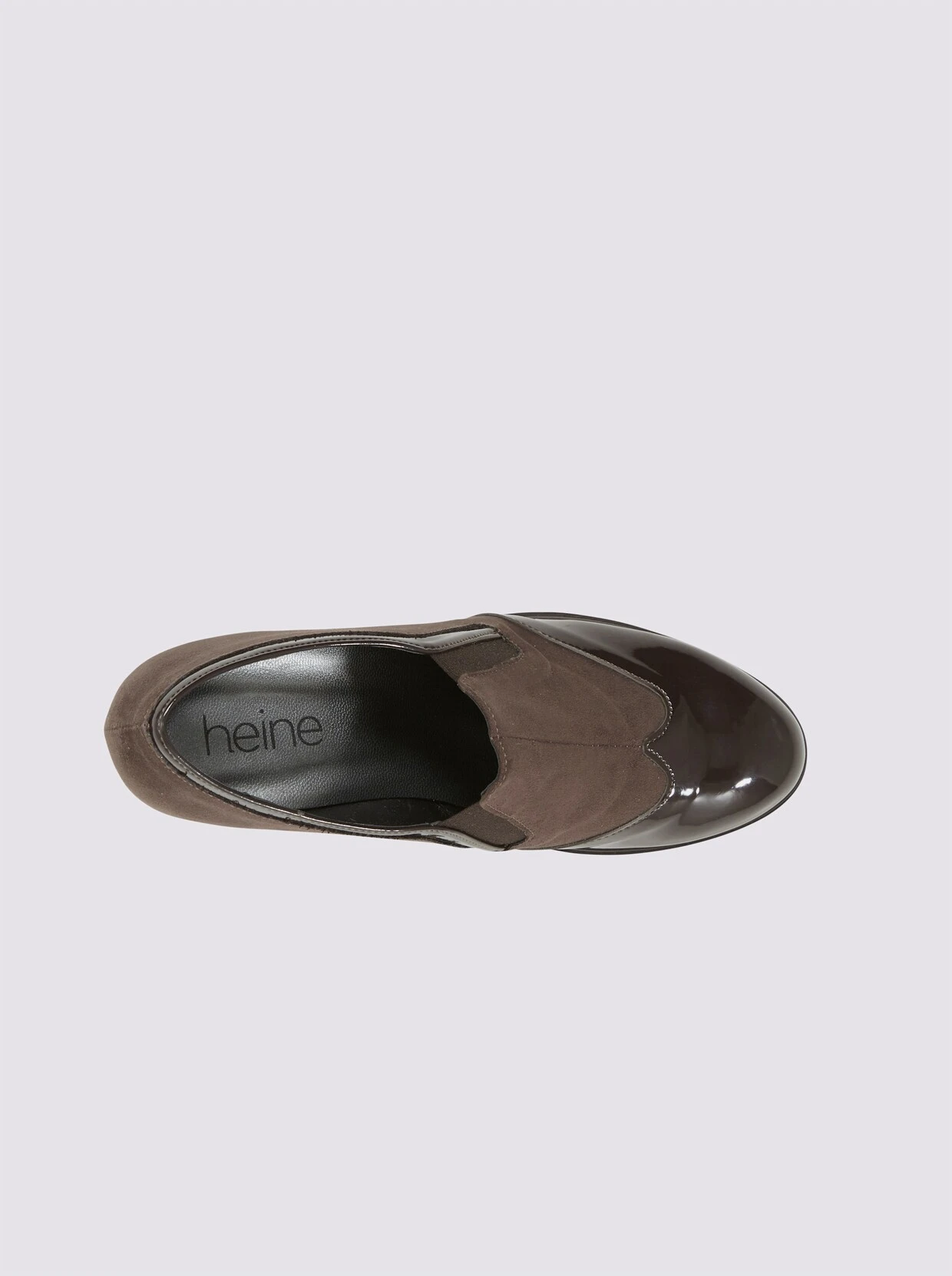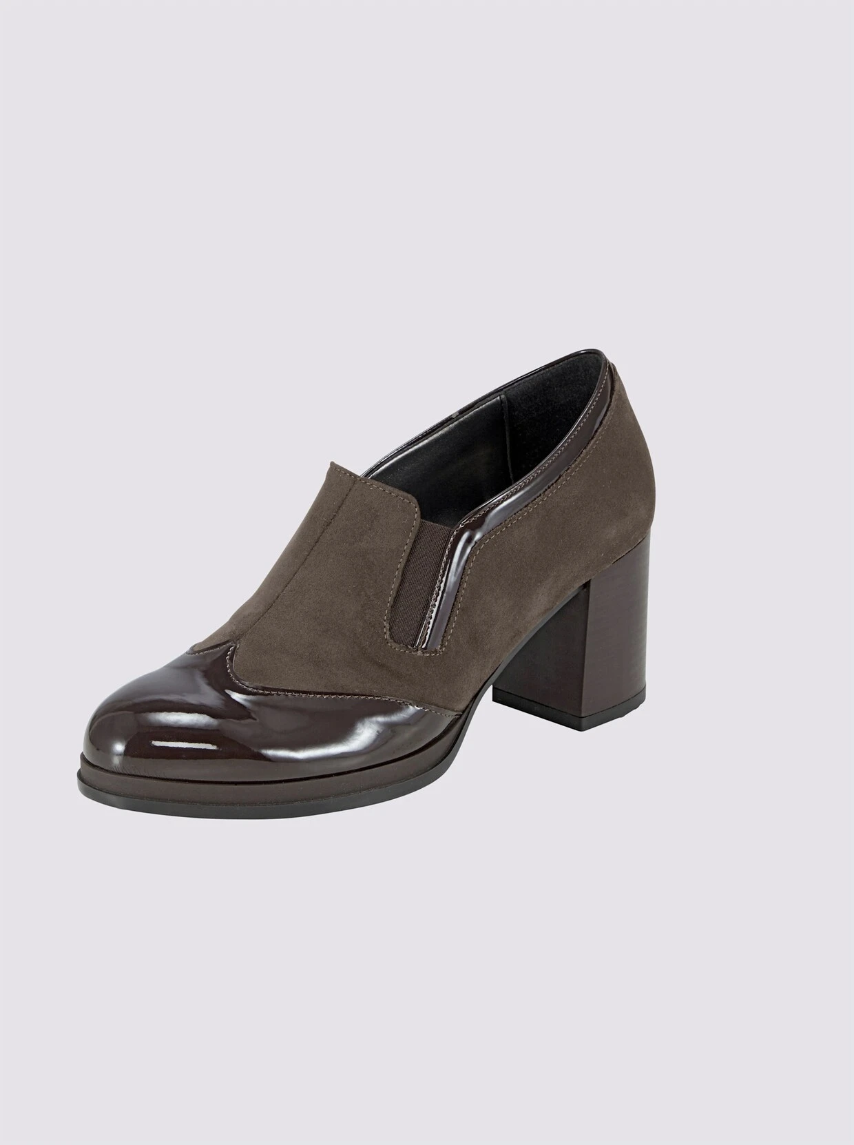 Hochfrontpumps Aus Synthetik-Ware in Lack- und Matt-Optik. Mit Elastikeinsätzen und Blockabsatz. Futter: Synthetik. Innensohle: Leder. Absatzhöhe ca. 60 mm.