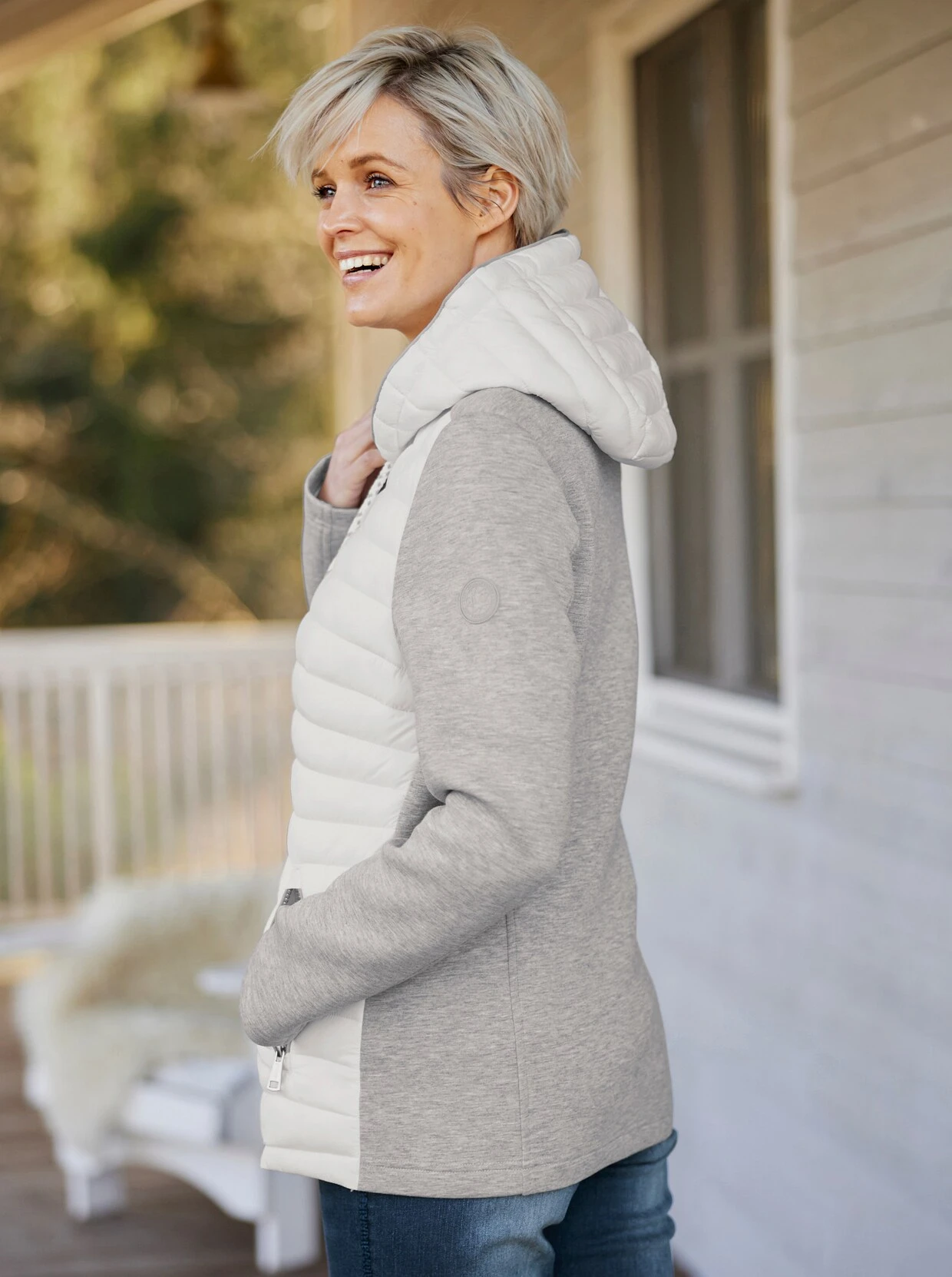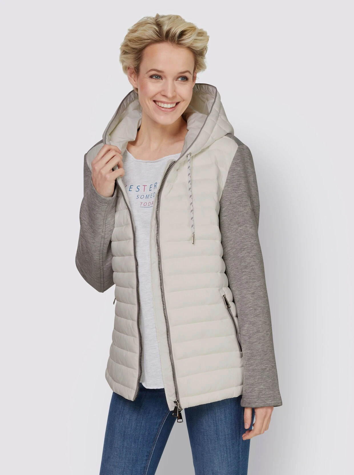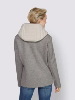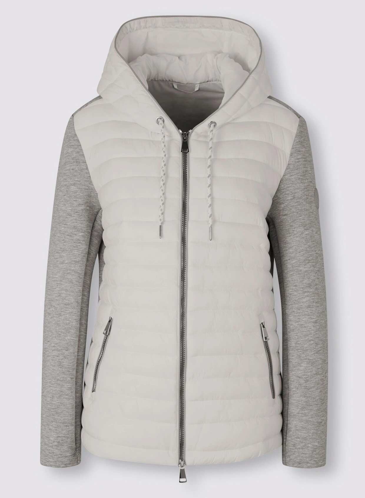 Jacke Perfekter Kombi-Partner für den Übergang! Vorne Stepp, Ärmel und Rückteil meliert. Sportiver Look mit Kapuze und kontrastfarbiger Kordel. 2-Wege-Reißverschluss und Reißverschlusstaschen.