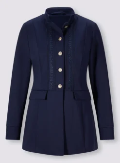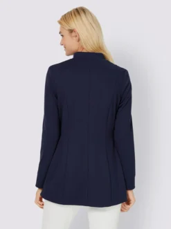 Jersey-Blazer Toller Begleiter in moderner Longform. Modischer Stehkragen. Biesen und Spitzenbordüre im Vorderteil. Mit aufgesetzten Pattentaschen. Knopfleiste mit Schmuckknöpfen. Optimaler Tragekomfort dank Elasthan-Anteil.