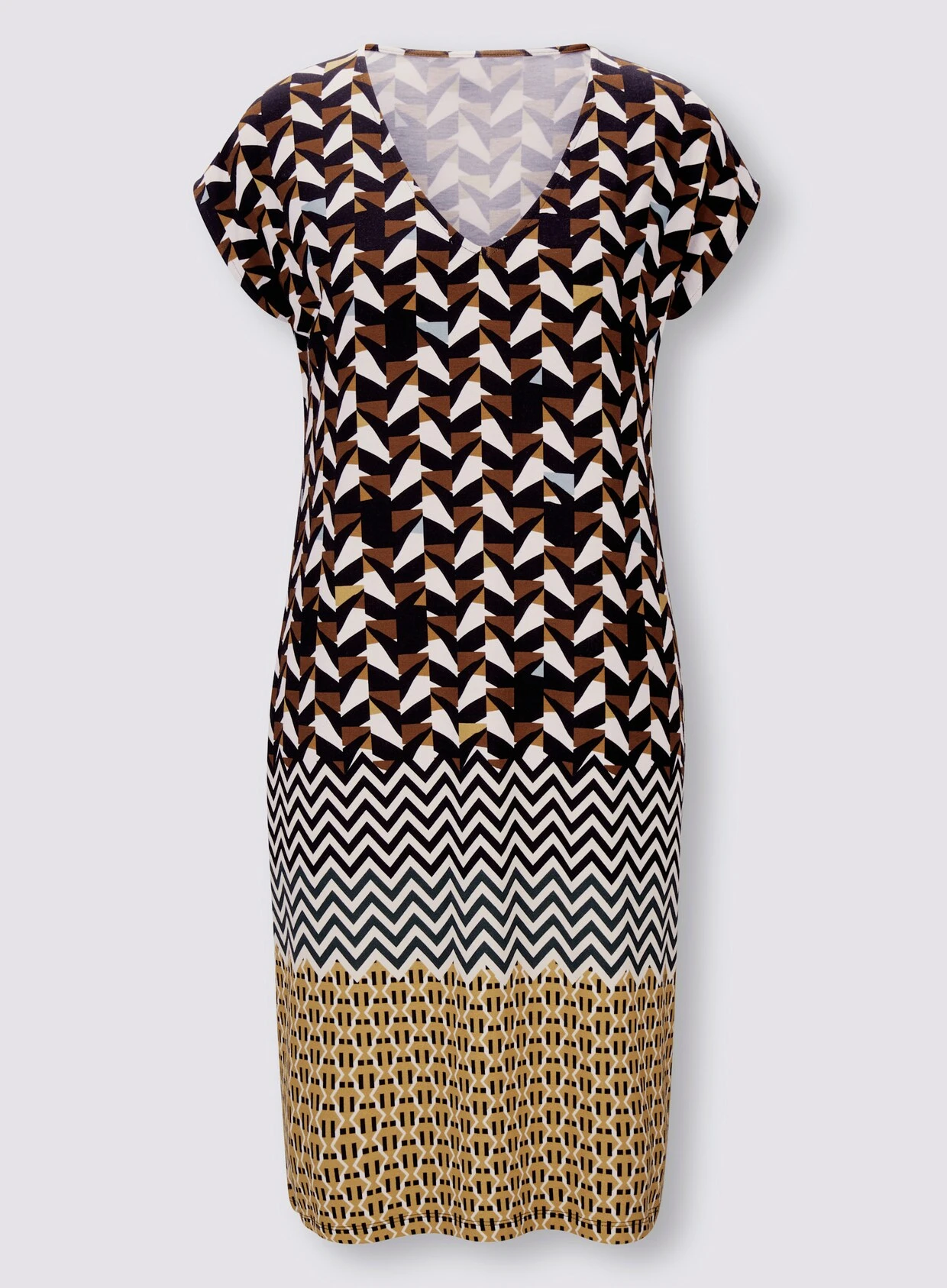 Jersey-Kleid Mode-Highlight mit trendstarkem Grafik-Dessin. In bequemer Schlupfform, mit Kurzarm und V-Ausschnitt.