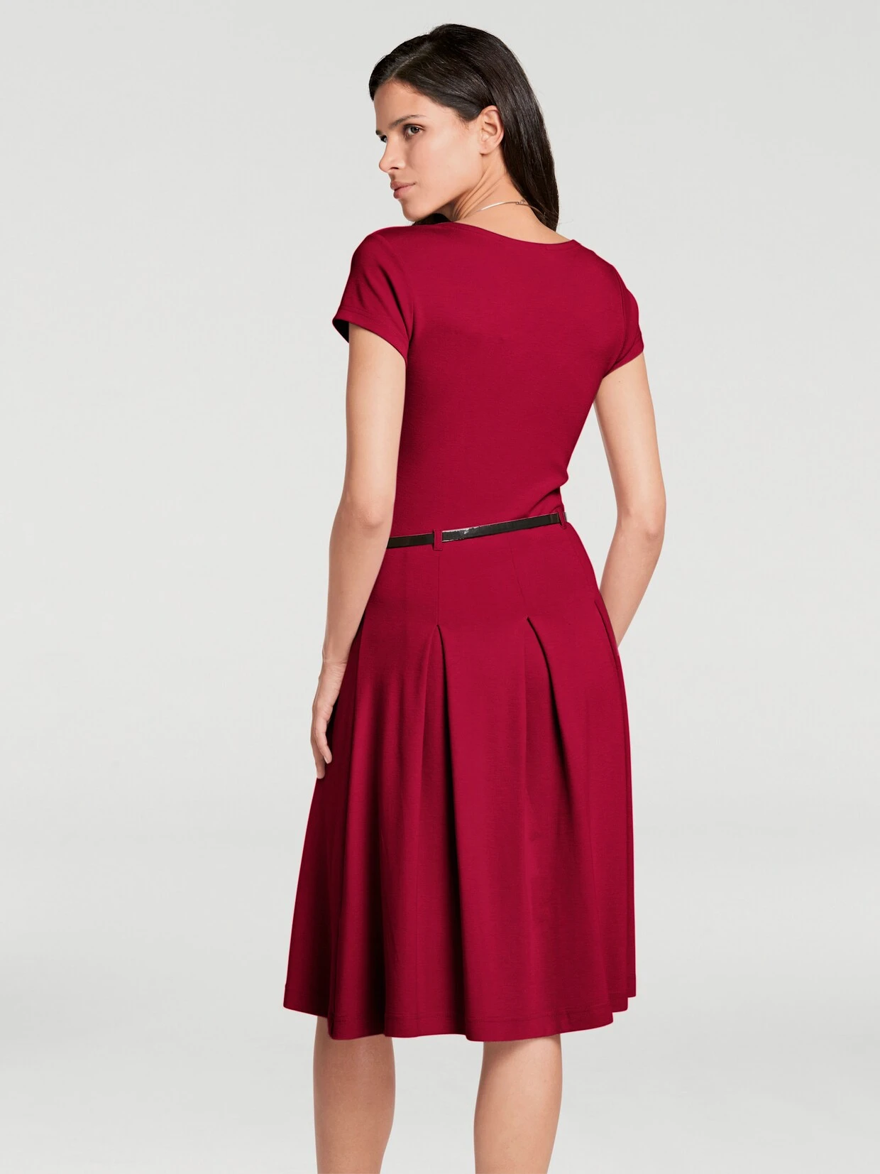 Jersey-Kleid Sehr feminin mit figurbetontem Oberteil, schmeichelndem Carrée-Ausschnitt und Kurzarm. Weit ausgestellter Rock mit Kellerfalten und Gürtel. Formstabil und passperfekt dank hochwertiger Viskose-Mischqualität.