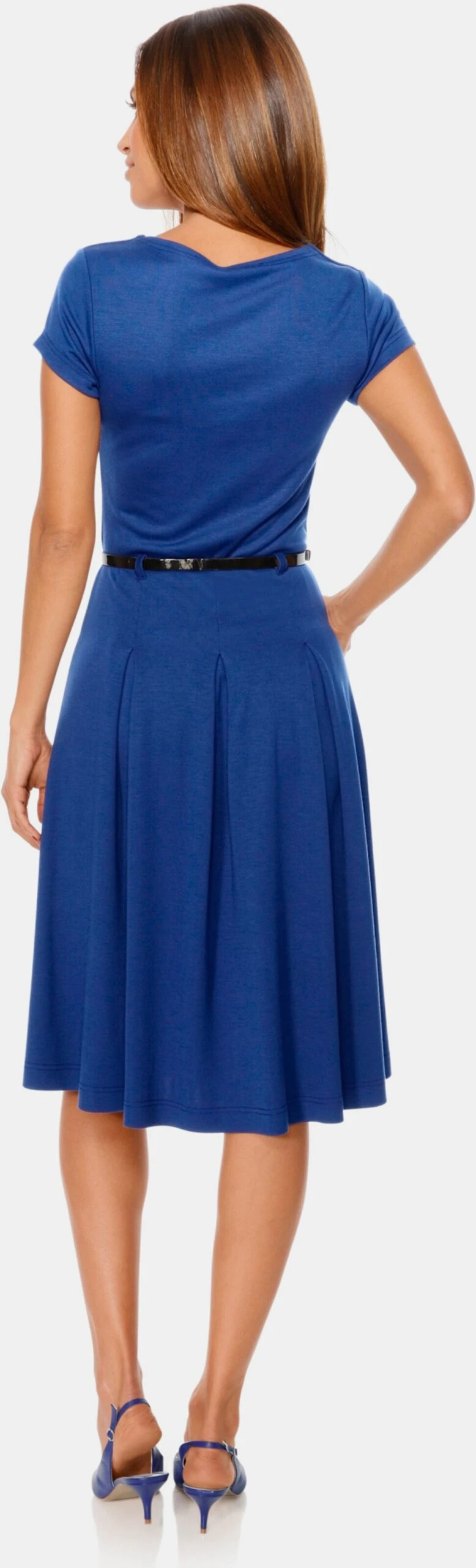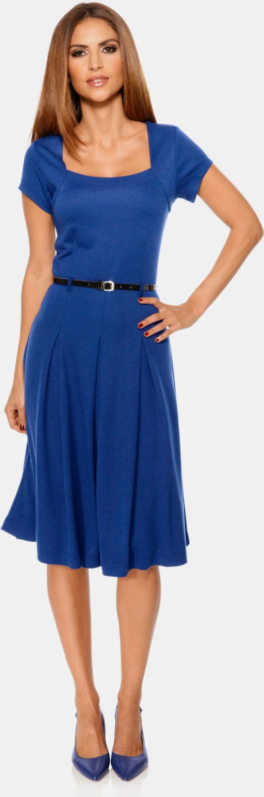 Jersey-Kleid Sehr feminin mit figurbetontem Oberteil, schmeichelndem Carrée-Ausschnitt und Kurzarm. Weit ausgestellter Rock mit Kellerfalten und Gürtel. Formstabil und passperfekt dank hochwertiger Viskose-Mischqualität.