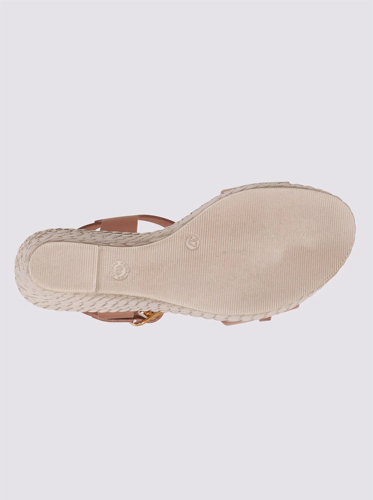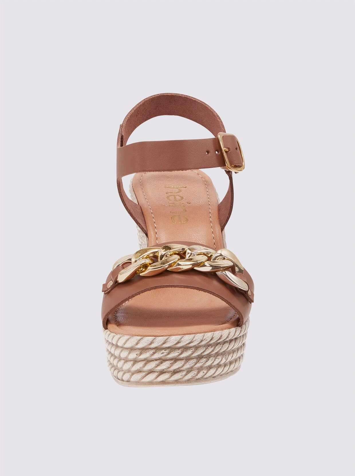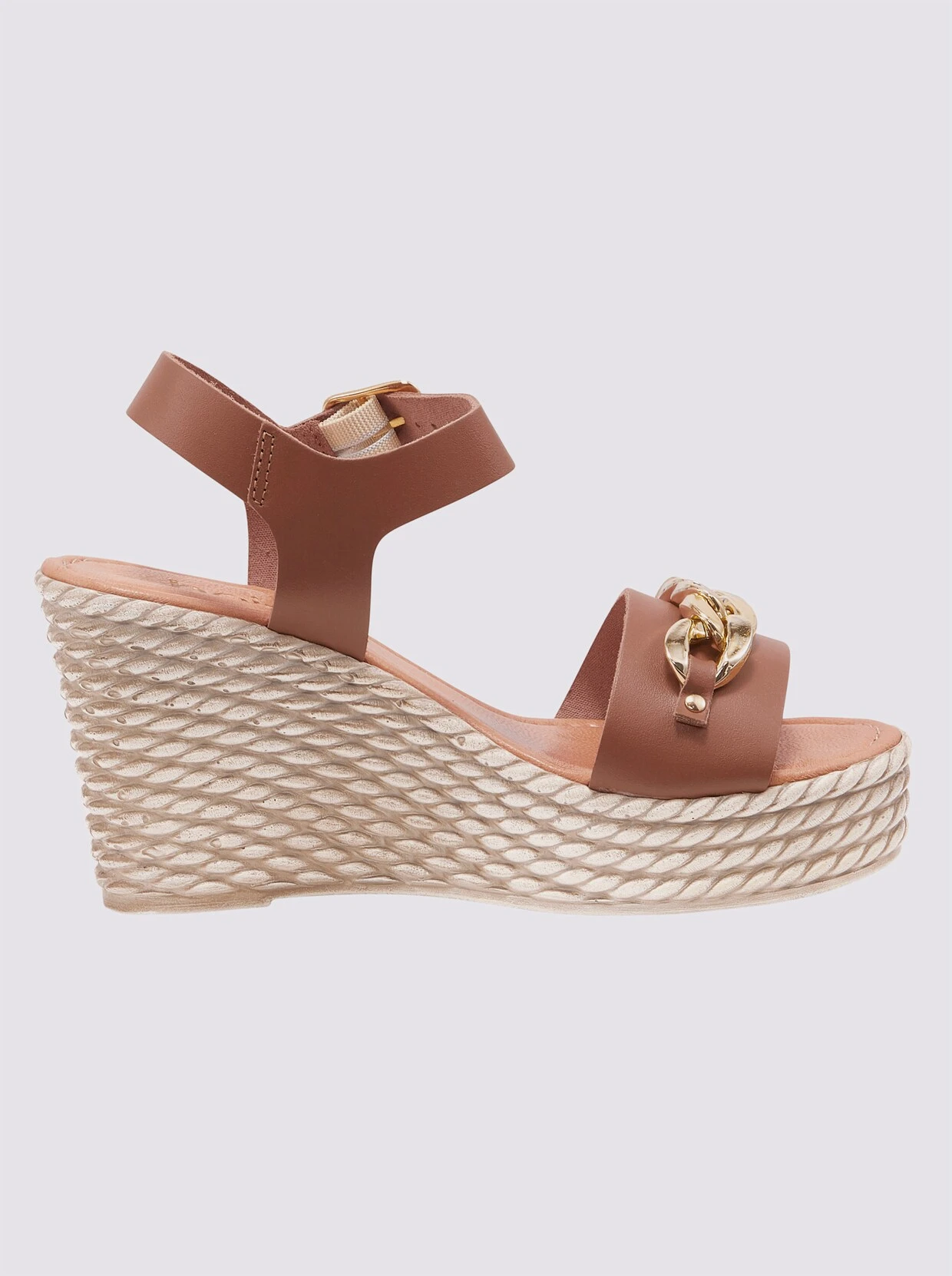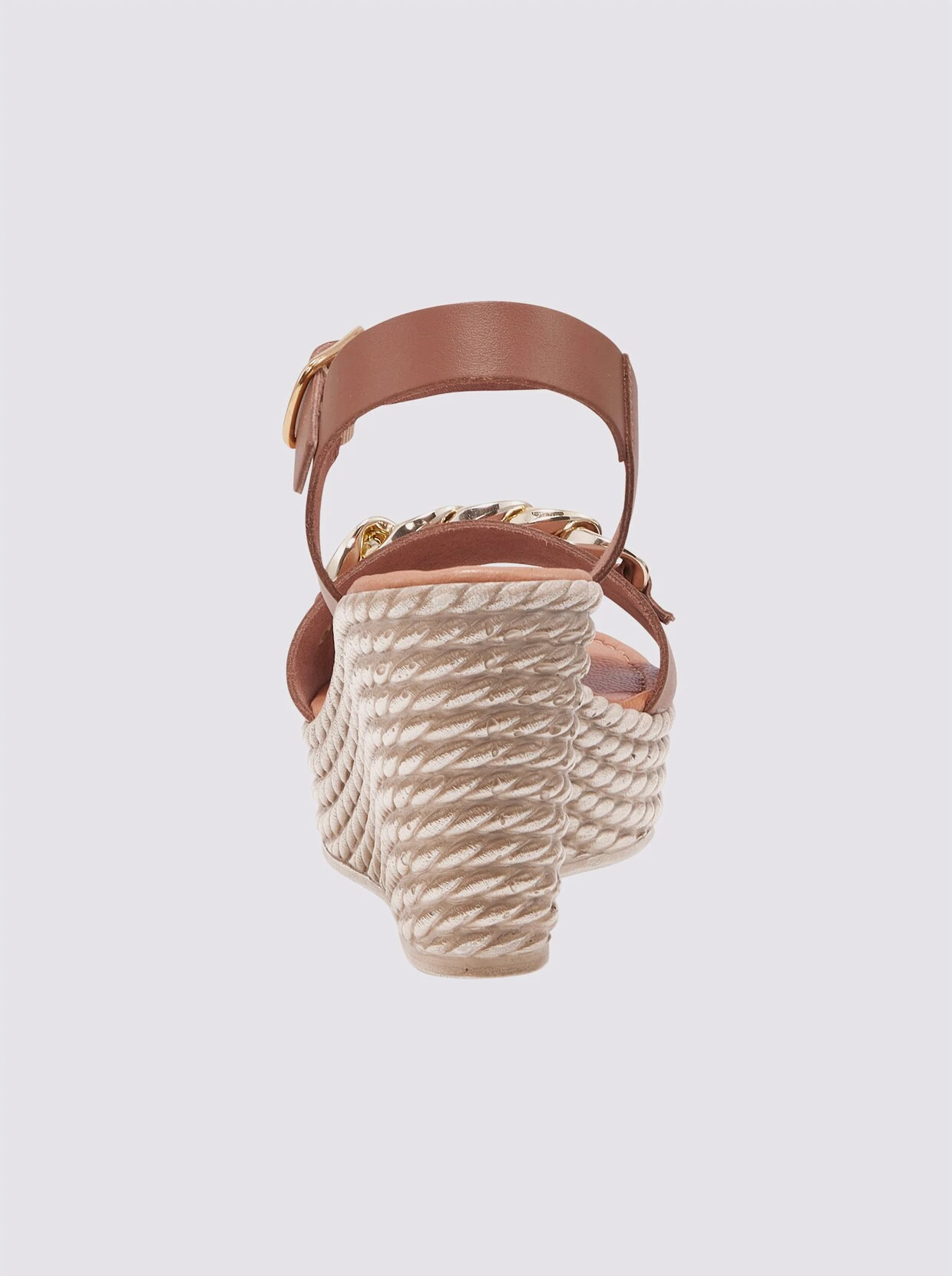 Keilsandalette Made in Italy. Mit Plateau in sommerlicher Flecht-Optik und dekorativem Kettenelement auf Blatt und Schließe. Toller Mix aus Kalb-Glattleder und Synthetik. Innensohle: Leder. Absatzhöhe ca. 80 mm.