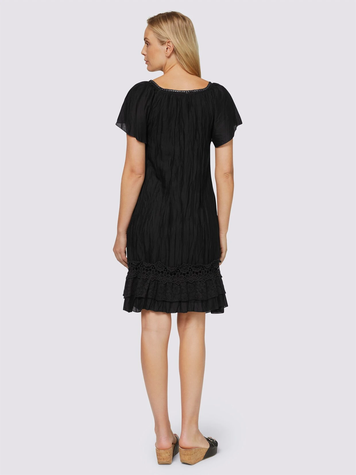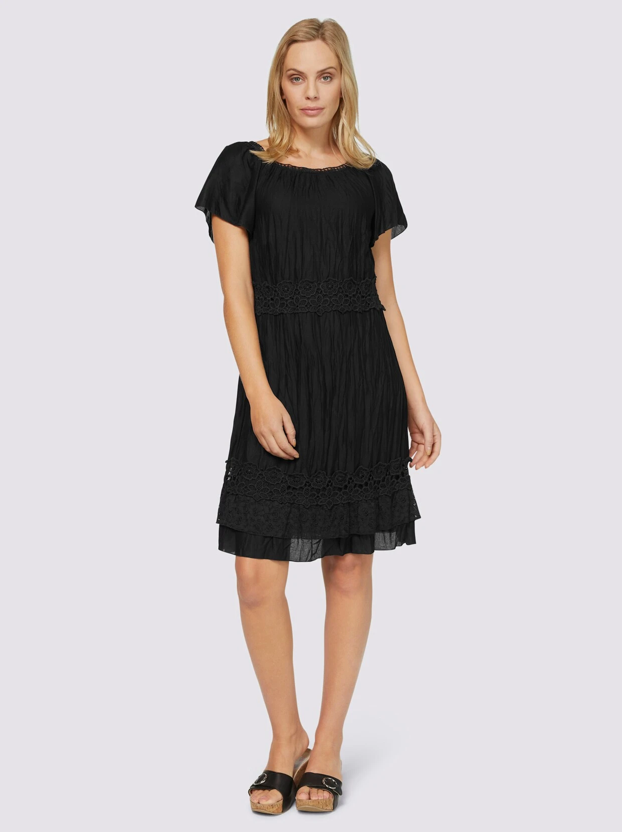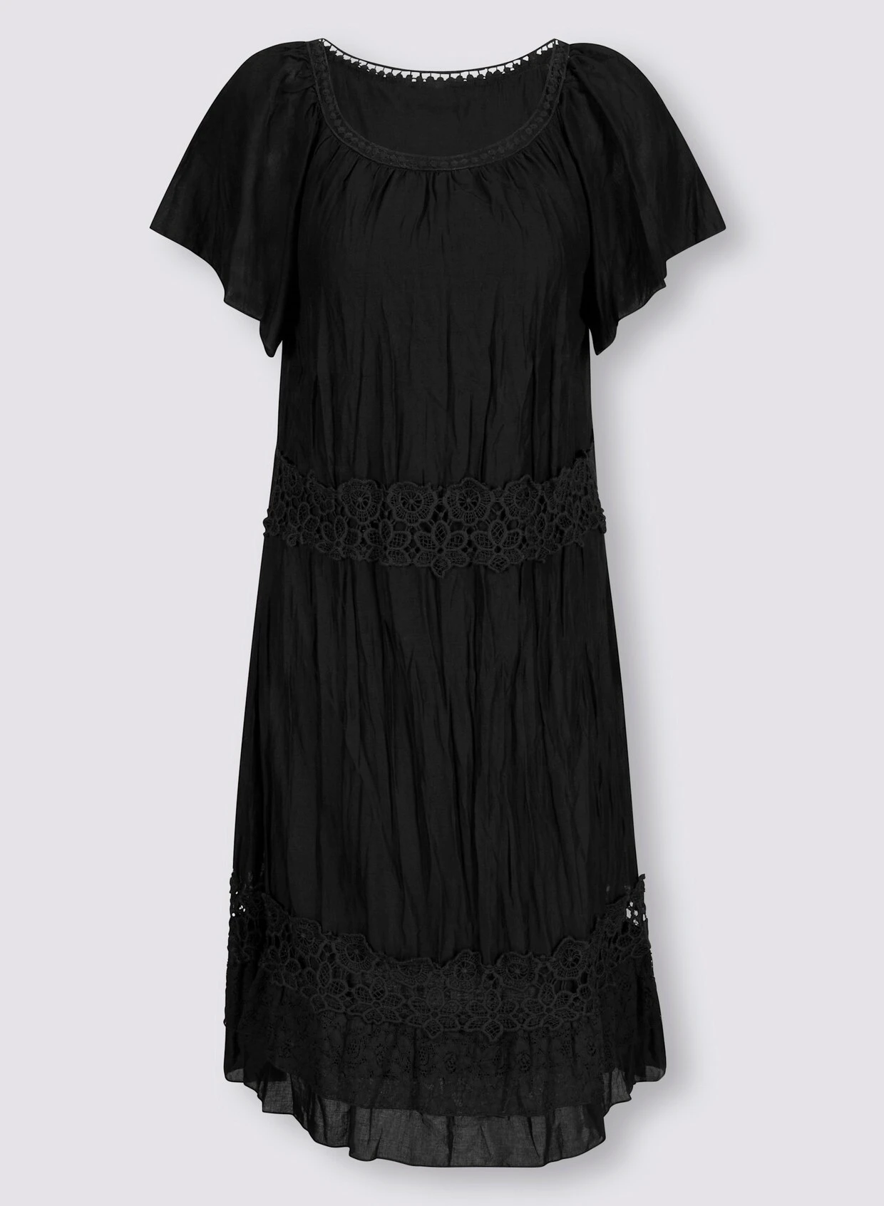 Kleid Attraktiver Eyecatcher mit edlen Details aus Madeira-Spitze. Verschlusslos, mit Kurzarm und Volant-Abschluss. Rundhalsausschnitt mit feinem Crochet-Band. Weiche, trageangenehme Qualität in moderner Crash-Optik.