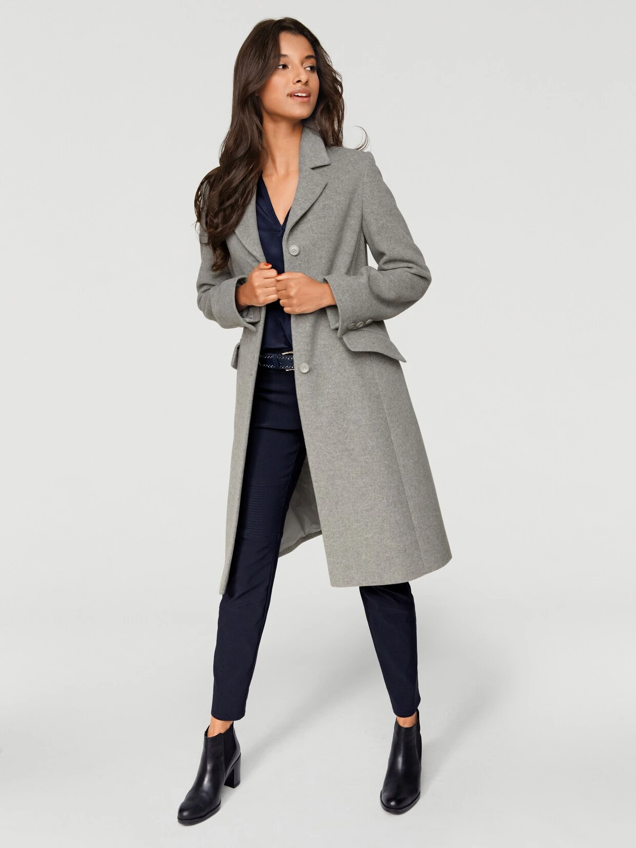 Kurzmantel Aktueller Style mit gepflegtem Reverskragen, modischen Schulterpolstern und Pattentaschen. Figurbetonte Form, mit Knopfverschluss. In softer, winterwarmer Qualität.