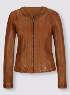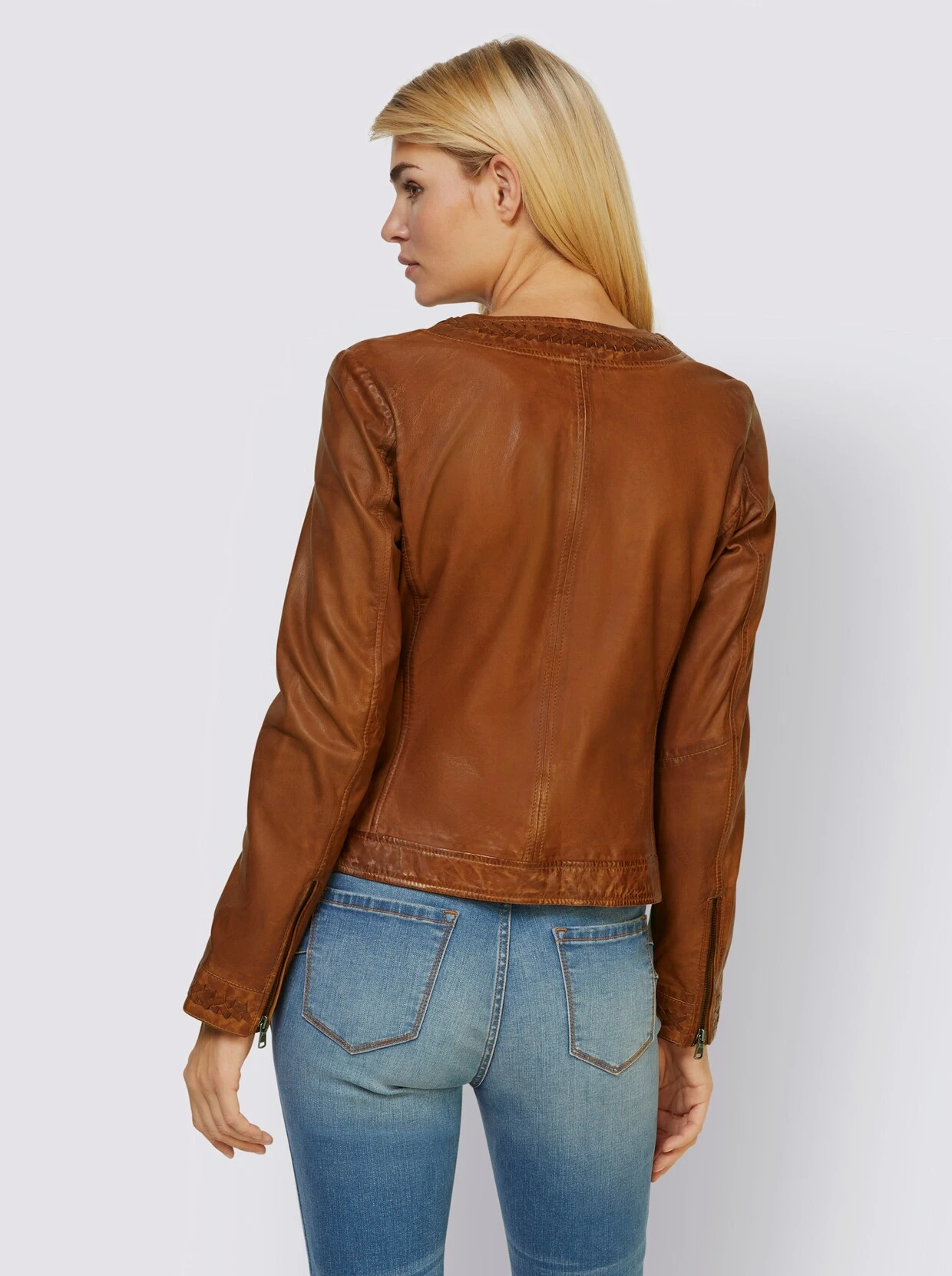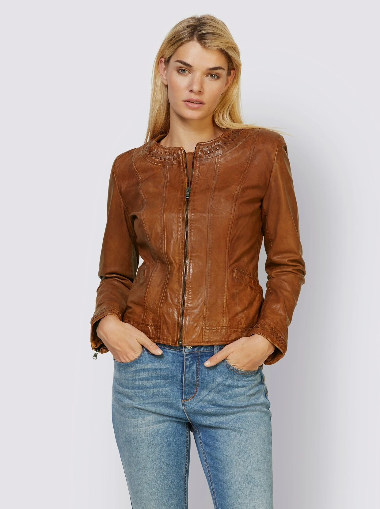 Leder-Jacke Geschmeidiges Lammnappa mit Flecht-Optik an den Abschlüssen. Jede Jacke ein individuelles Einzelstück. Sportive Kurzform mit aufwendigen Teilungsnähten, Rundhalsausschnitt und Reißverschluss. Eingrifftaschen mit verdecktem Druckknopf. Langarm mit Zipper.