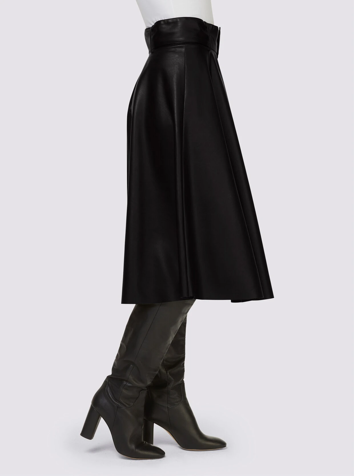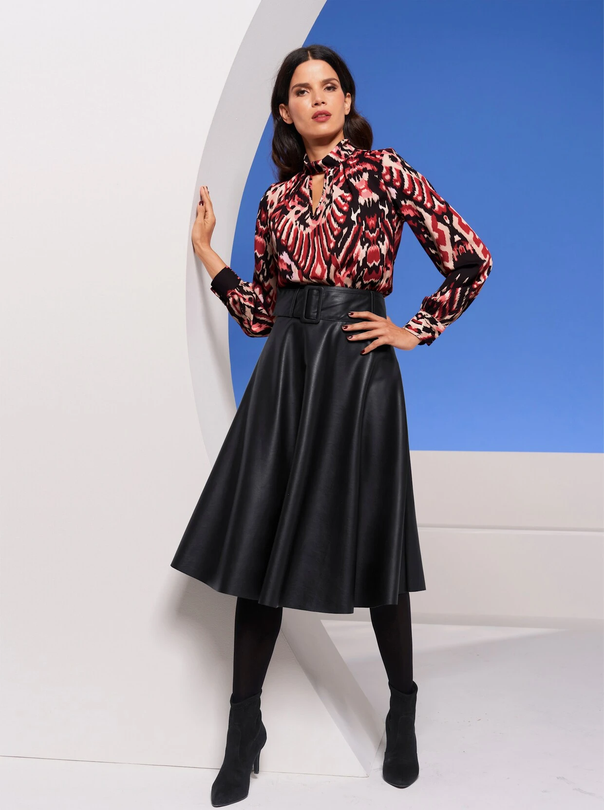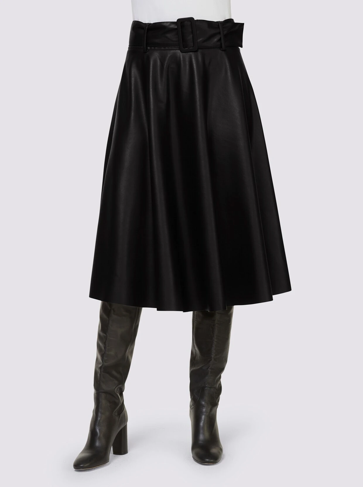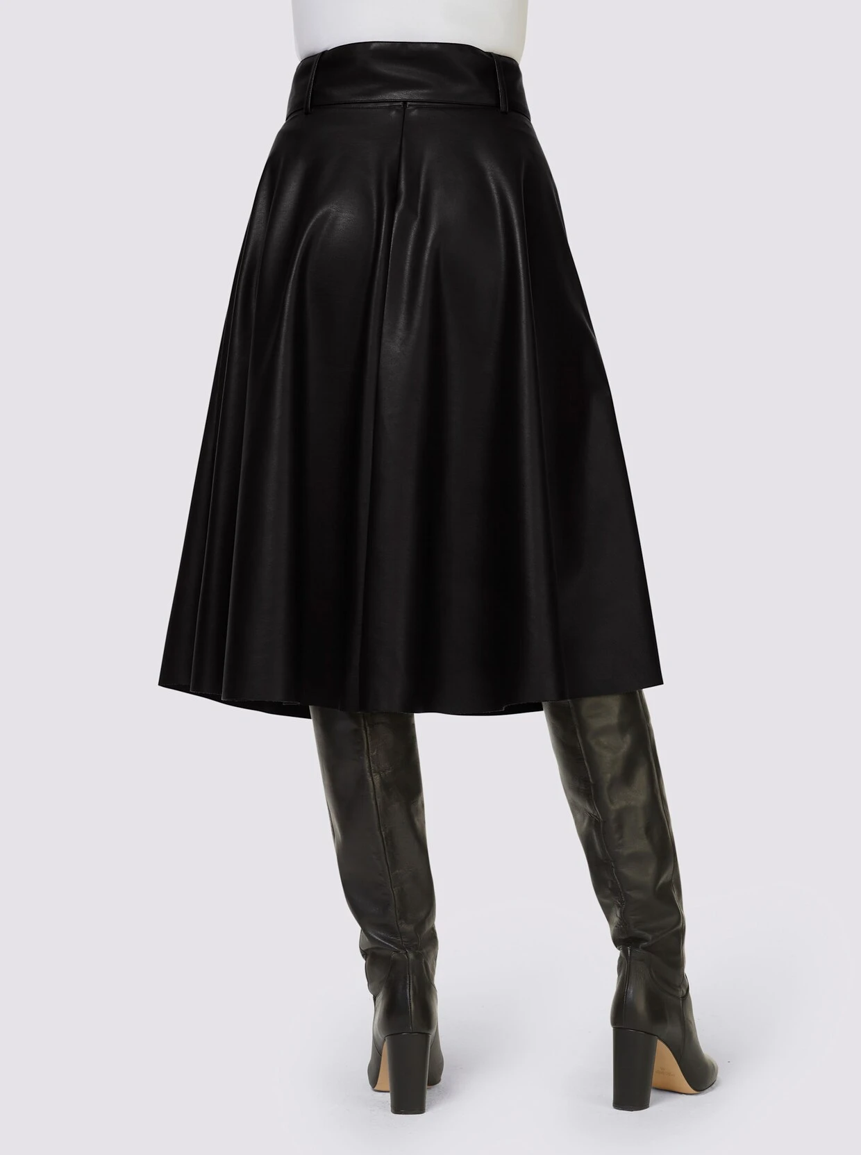 Lederimitat-Rock In feminin ausgestellter, schwingender A-Linie. Mit passendem Gürtel, hinten mit nahtfeinem Reißverschluss und Knopf zu schließen. Handschuhweiches Lederimitat mit PU-Beschichtung.