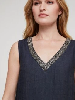 Leinenkleid Figurumspielende Form. Trageangenehmes Material. Femininer Style für viele Anlässe. Ärmellos. Knopfverschluss im Nacken.