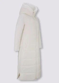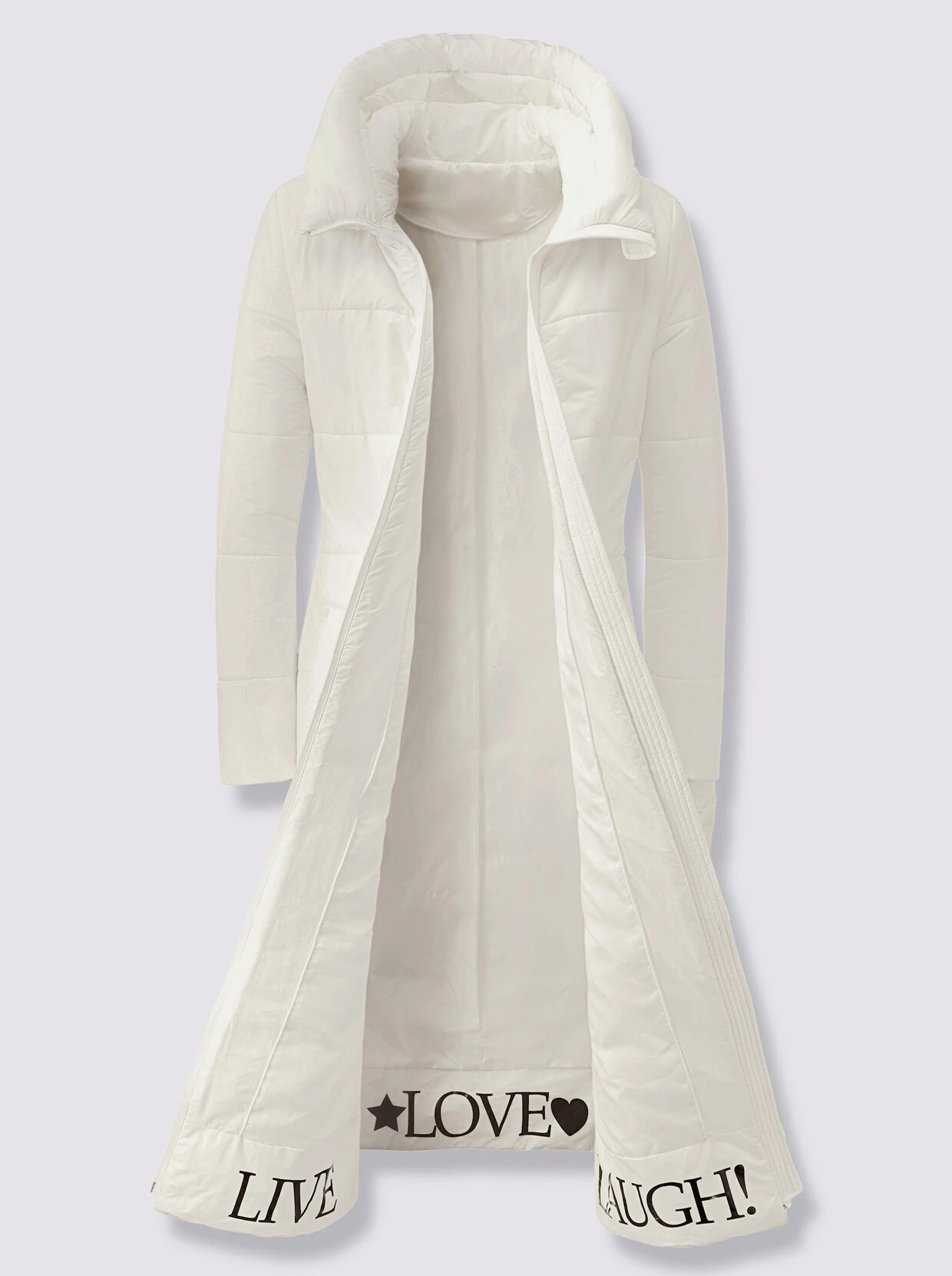 Mantel Top gestylt an kalten Tagen! Warm gefüttert und wattiert, mit Kapuze und 2-Wege-Zipper. Gerader Schnitt mit Seitenreißverschlüssen für mehr Bewegungsfreiheit. Mit stylischem „LIVE, LOVE, LAUGH!“ Schriftzug und Herz- und Stern-Motiv an der Saum-Innenseite.