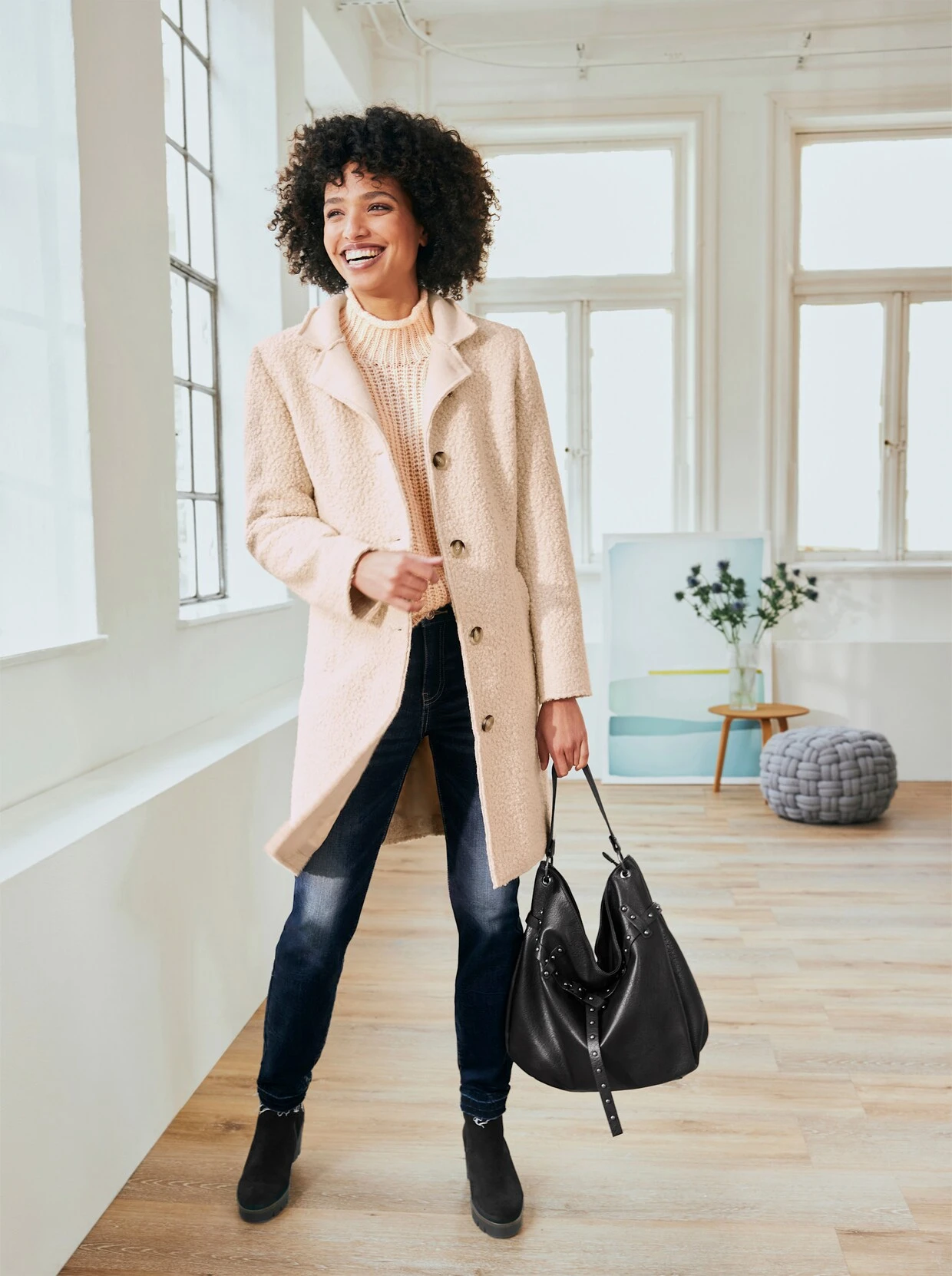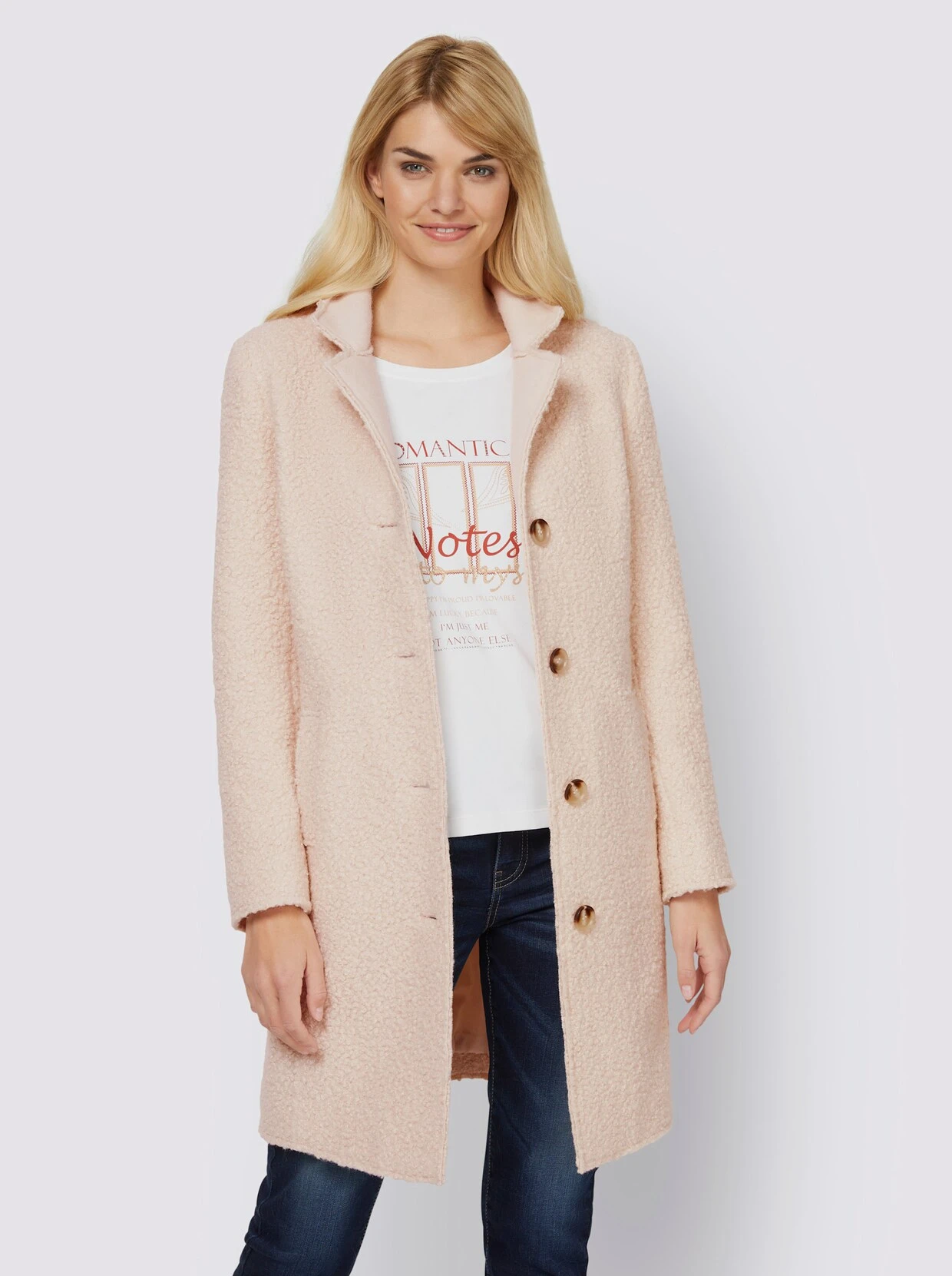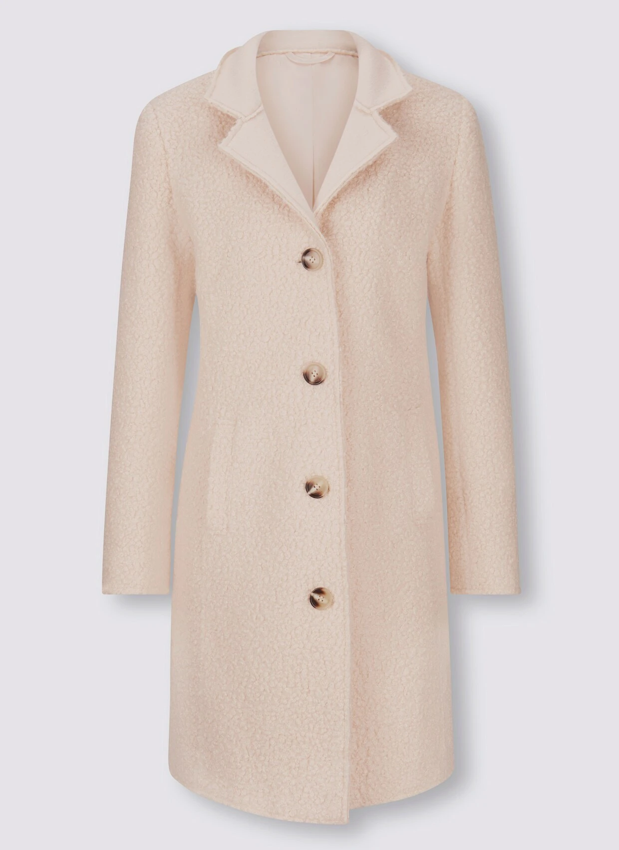 Mantel Kombistarker Klassiker für den Winter, in flauschig weicher Bouclé-Qualität. Reverskragen zum Stehkragen variierbar. Formgebende Wiener Nähte. Mit Knopfverschluss. 2 Eingrifftaschen, 1 Innentasche.