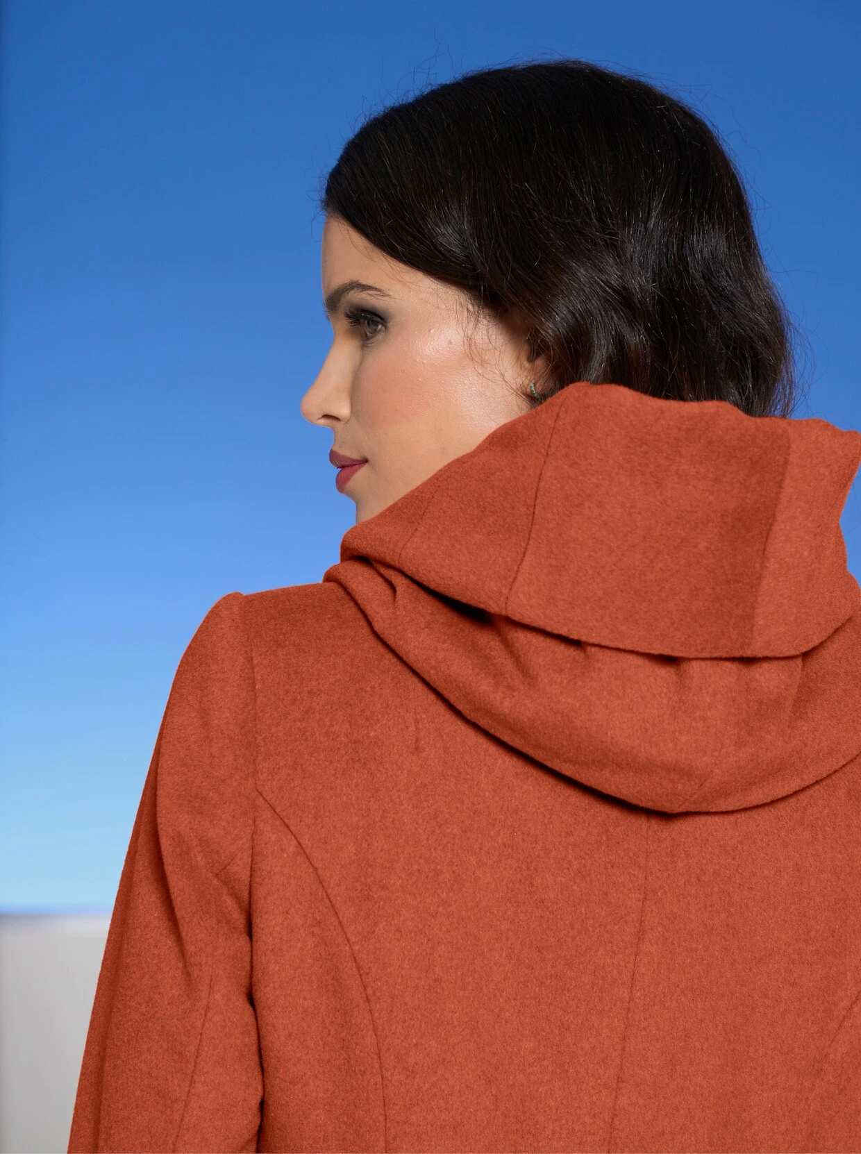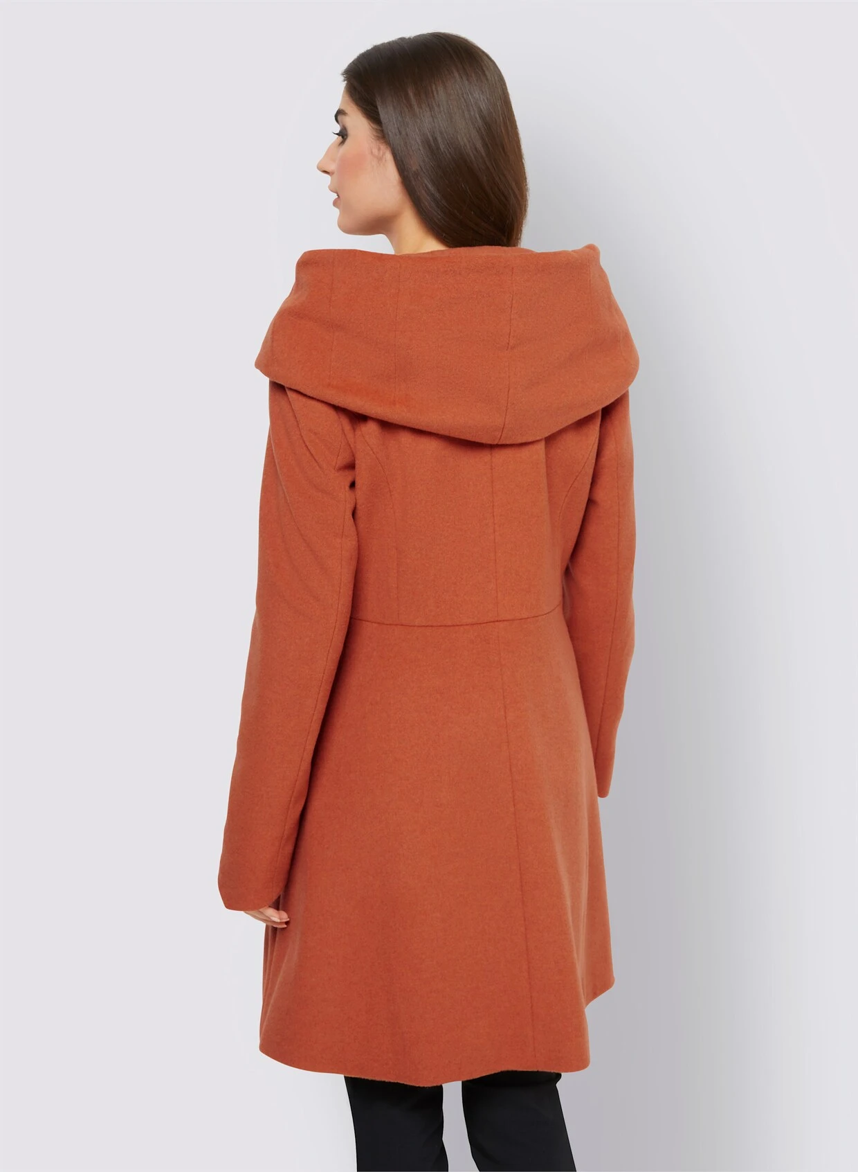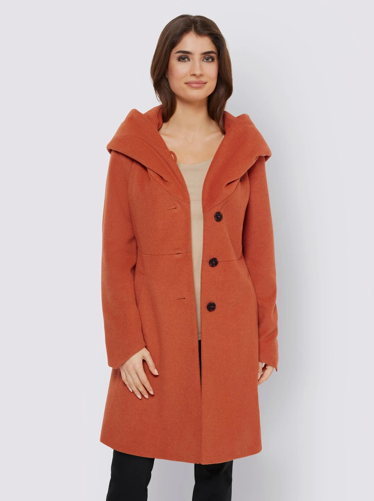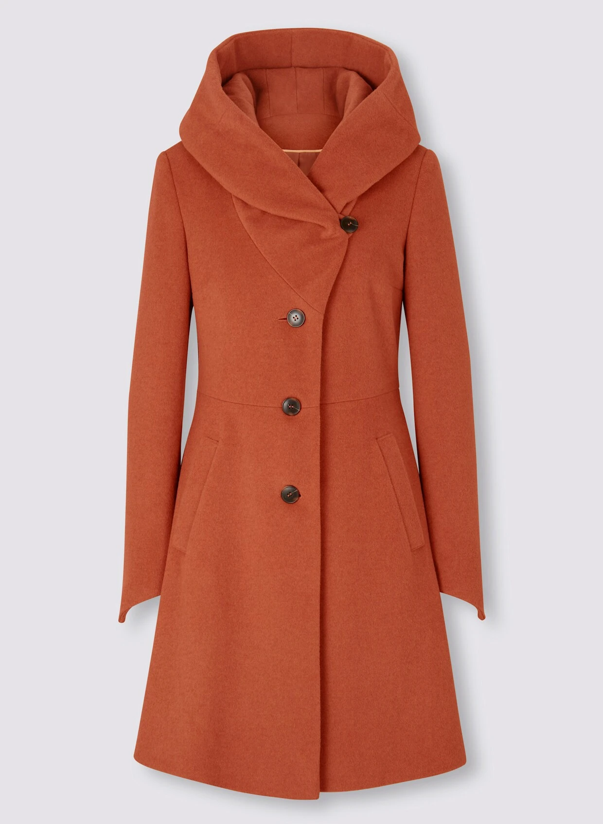 Mantel Perfekt für kalte Tage! Femininer Schnitt: mit Taillennaht, unten leicht ausgestellt. Modische Kragenform mit Kapuze und Knopf. Vorne mit durchgehender Knopfleiste und Eingrifftaschen. Modischer Abschluss am Langarm. Weiche, leicht angeraute Ware.