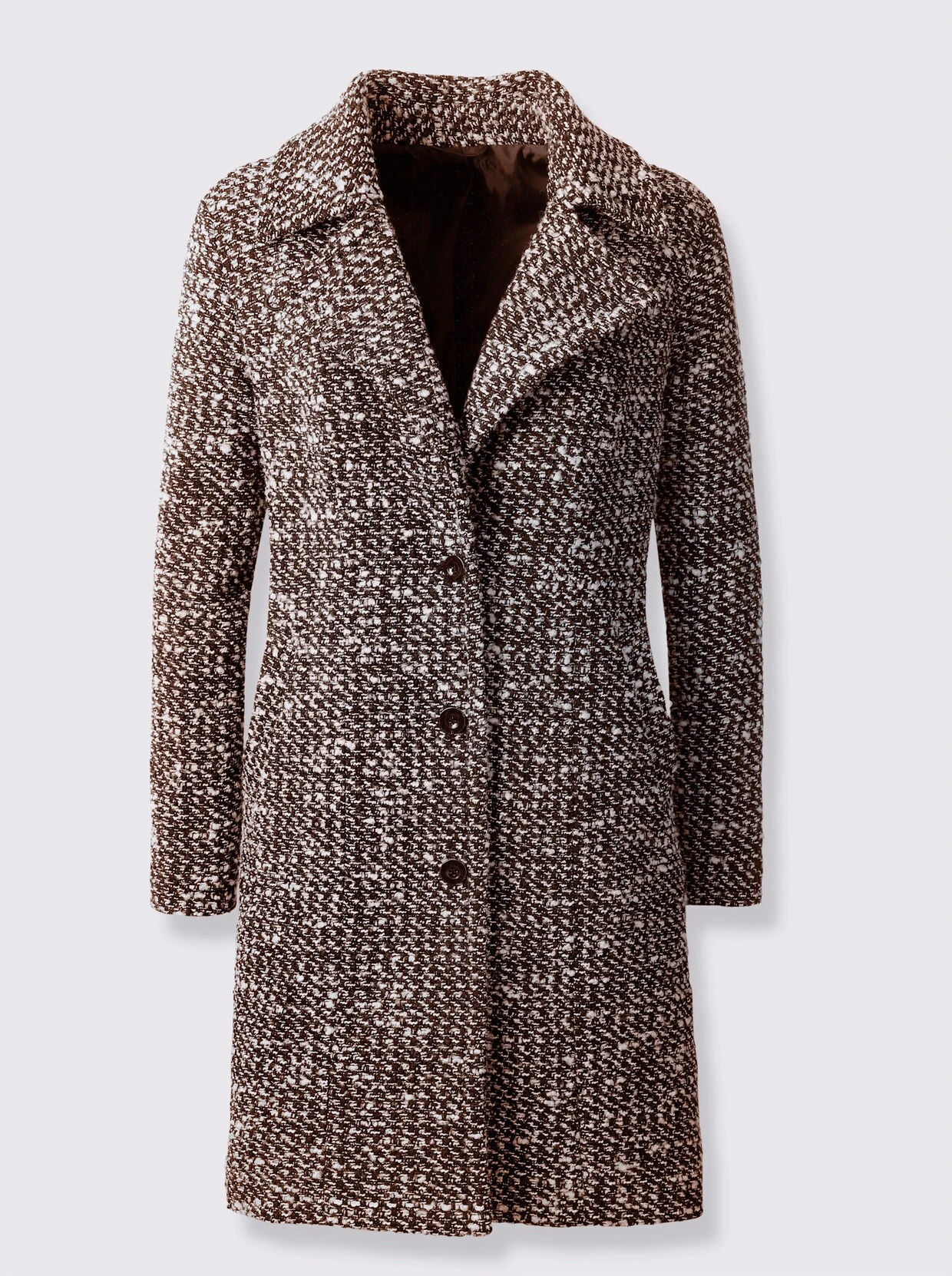 Mantel In winterlicher Bouclé-Qualität, mit Reverskragen, Eingrifftaschen und Innentasche. Gerade Form, passperfekt dank Wiener Nähten. Auf 3 Knöpfe zu schließen.