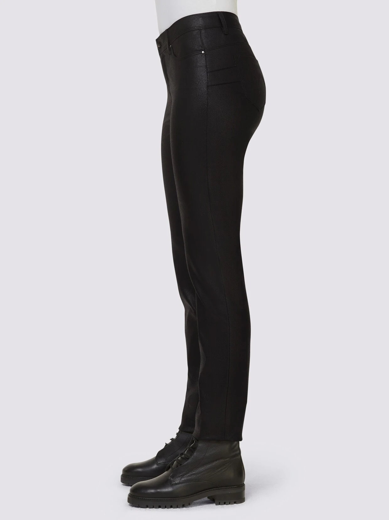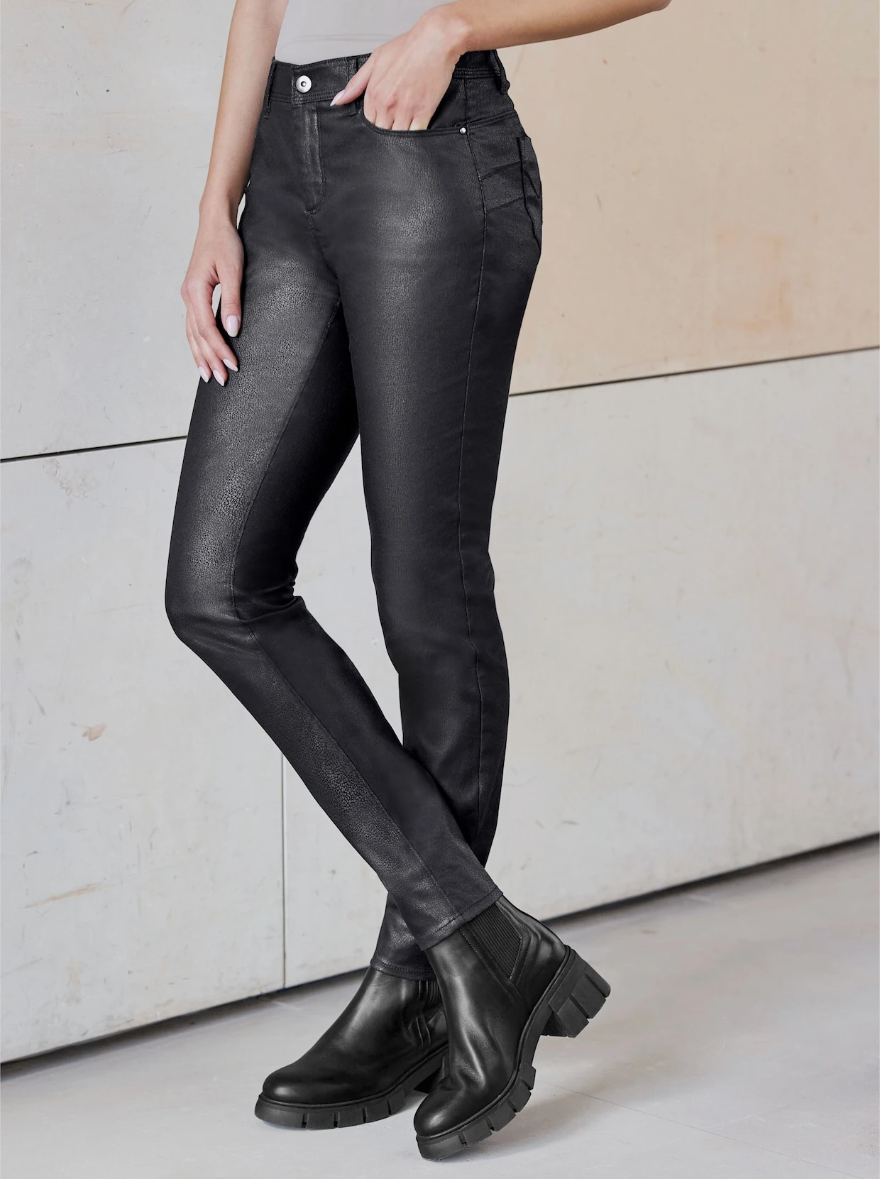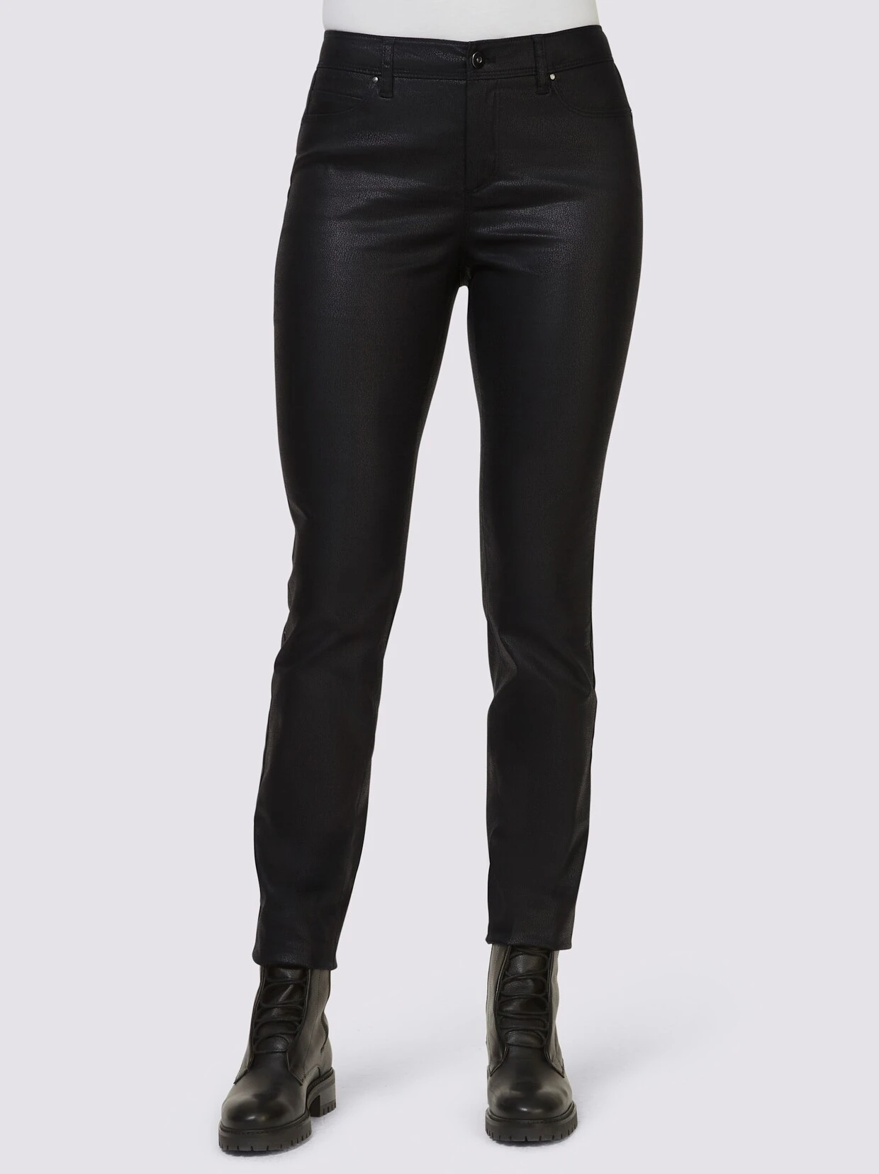 Push-up-Hose Angesagtes 5-Pocket-Modell in glänzender Leder-Optik, mit seitlichen Eingrifftaschen. Slim Fit. Normale Leibhöhe. Fußweite ca. 30 cm. Unterstützt die Initiative Cotton made in Africa.
