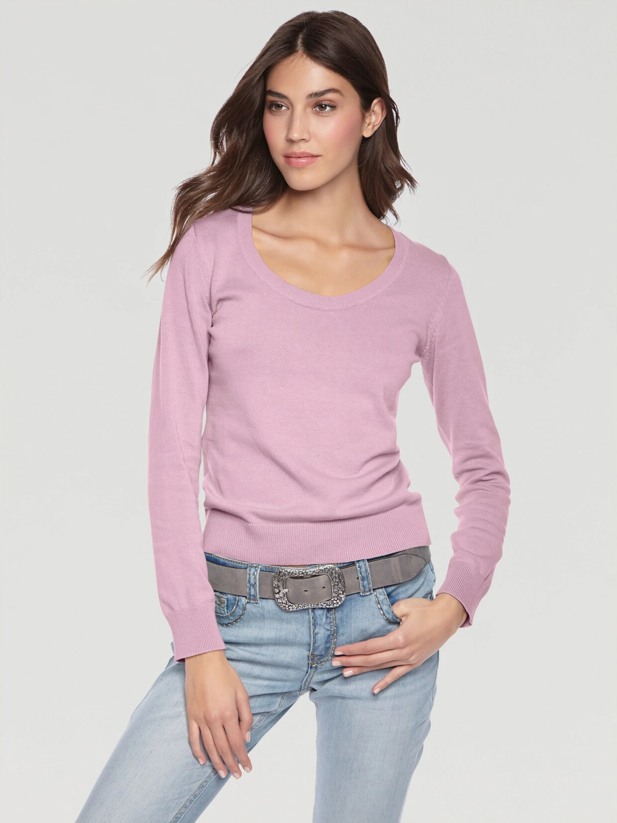 Rundhals-Pullover Lässiger Allrounder im angenehmen Feinstrick aus reiner Baumwolle. Figurbetont, mit großem Rundhalsausschnitt, Langarm und Rippenbündchen.