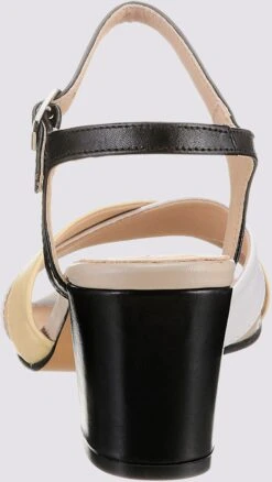 Sandalette Made in Spain. Im modernen Farbmix, mit Gummi-Laufsohle und atmungsaktiven Eigenschaften. Hochwertiges Ziegen-Nappaleder. Futter: Textil, Innensohle: Leder. Blockabsatz, Höhe ca. 50 mm.