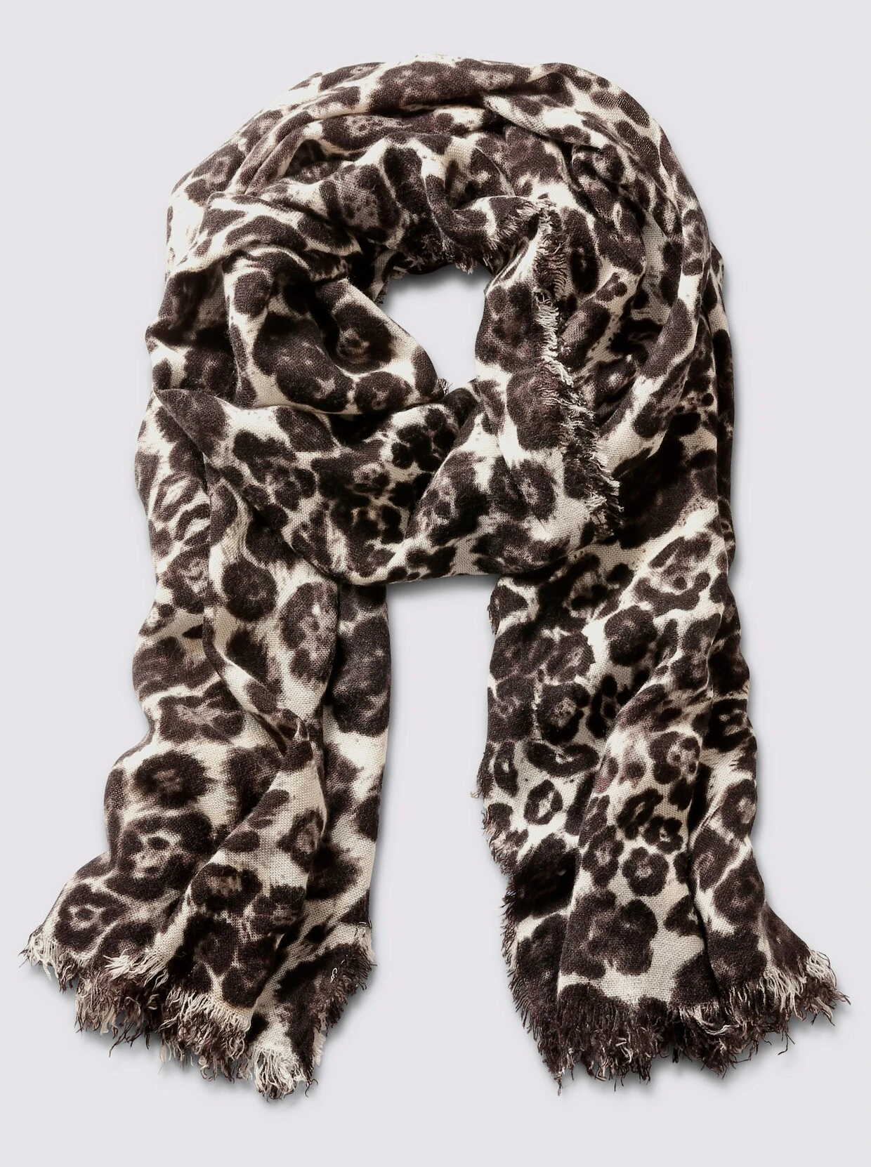 Schal In Langform. Wunderbar weiche Qualität. Mit angesagtem Leo-Muster und modernen offenen Kanten. Ca. 198/87 cm.