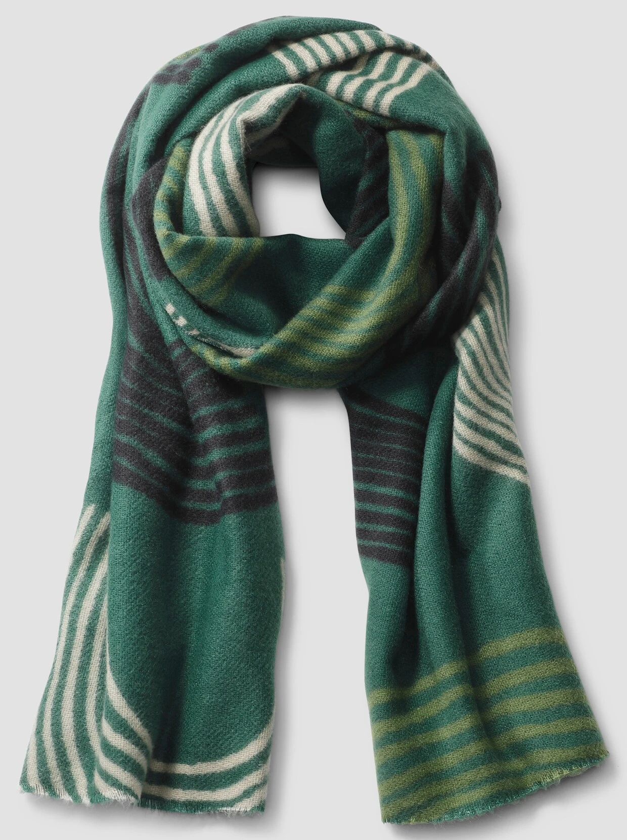 Schal In zeitlosem Dessin. Aus reiner Viskose. Angenehm weich und wärmend. Muster in Bogenform. Bewusst offene Kantenverarbeitung. Ca. 80×177 cm.