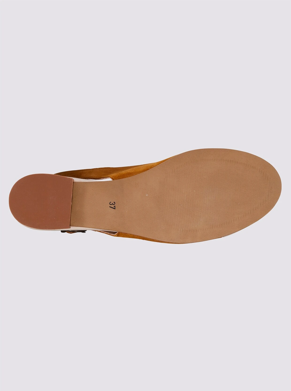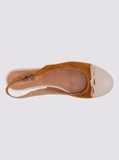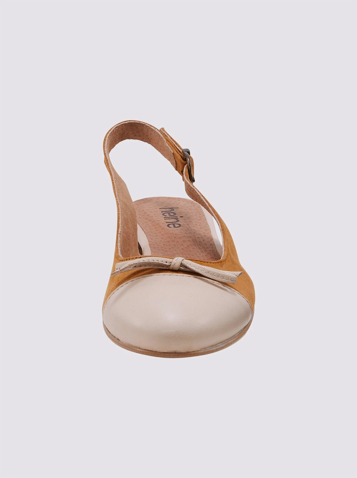 Slingballerina Made in Portugal. Edler Mix aus Ziegen-Nappa- und Veloursleder. Mit dekorativer Schleife und Fersenriemen mit Schließe. Futter und Innensohle: Leder. Mit Blockabsatz, Höhe ca. 10 mm.