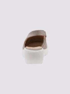 Slingpumps Made in Spain. Trendstarker Style mit kontrastfarbener Sohle, elastischem Riemen und Keilabsatz. Pastell-gestreift aus Textil, goldfarben aus Ziegen-Nappa-, hellblau und grau aus Rind-Velours- und weiß aus Rind-Nappaleder. Futter: Textil, Innensohle: Leder. Absatzhöhe ca. 50 mm.