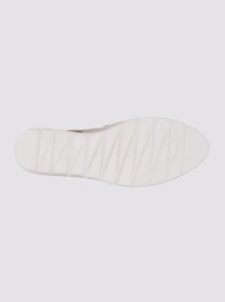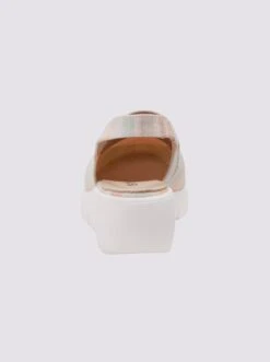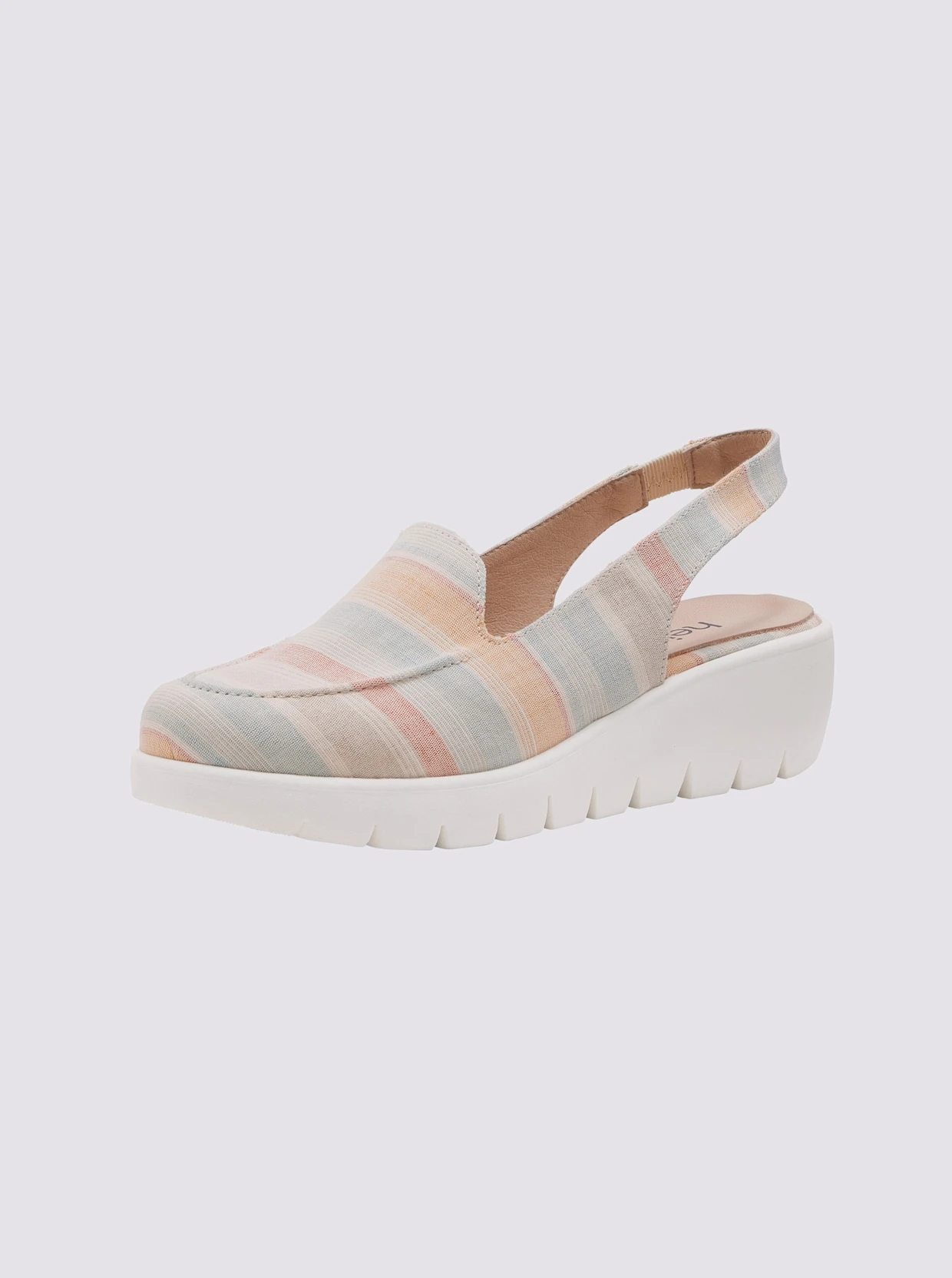 Slingpumps Made in Spain. Trendstarker Style mit kontrastfarbener Sohle, elastischem Riemen und Keilabsatz. Pastell-gestreift aus Textil, goldfarben aus Ziegen-Nappa-, hellblau und grau aus Rind-Velours- und weiß aus Rind-Nappaleder. Futter: Textil, Innensohle: Leder. Absatzhöhe ca. 50 mm.