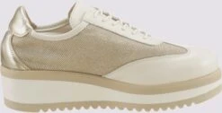 Sneaker Mit dekorativen Einsätzen. Schwarz, weiß, silberfarben, creme-goldfarben aus Rind-Nappaleder; weiß/silberfarben aus Ziegen-Nappaleder; sand-taupe und anthra-schwarz aus Rind- und Ziegen-Nappaleder. Innensohle: Leder. Kontrastfarbener Keilabsatz mit Profilsohle, Höhe ca. 50 mm.
