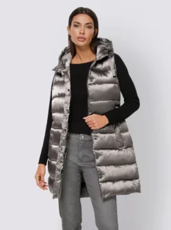 Steppweste Trendhighlight mit Outdoor-Charakter. Kapuze mit Tunnelzug und Bindeband. Gerade Form mit verdecktem 2-Wege-Zipper und Druckknopfleiste. Seitliche Eingrifftaschen. Warme Fake-Daune.