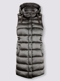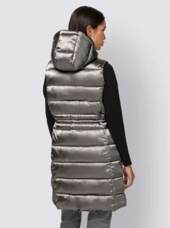 Steppweste Trendhighlight mit Outdoor-Charakter. Kapuze mit Tunnelzug und Bindeband. Gerade Form mit verdecktem 2-Wege-Zipper und Druckknopfleiste. Seitliche Eingrifftaschen. Warme Fake-Daune.