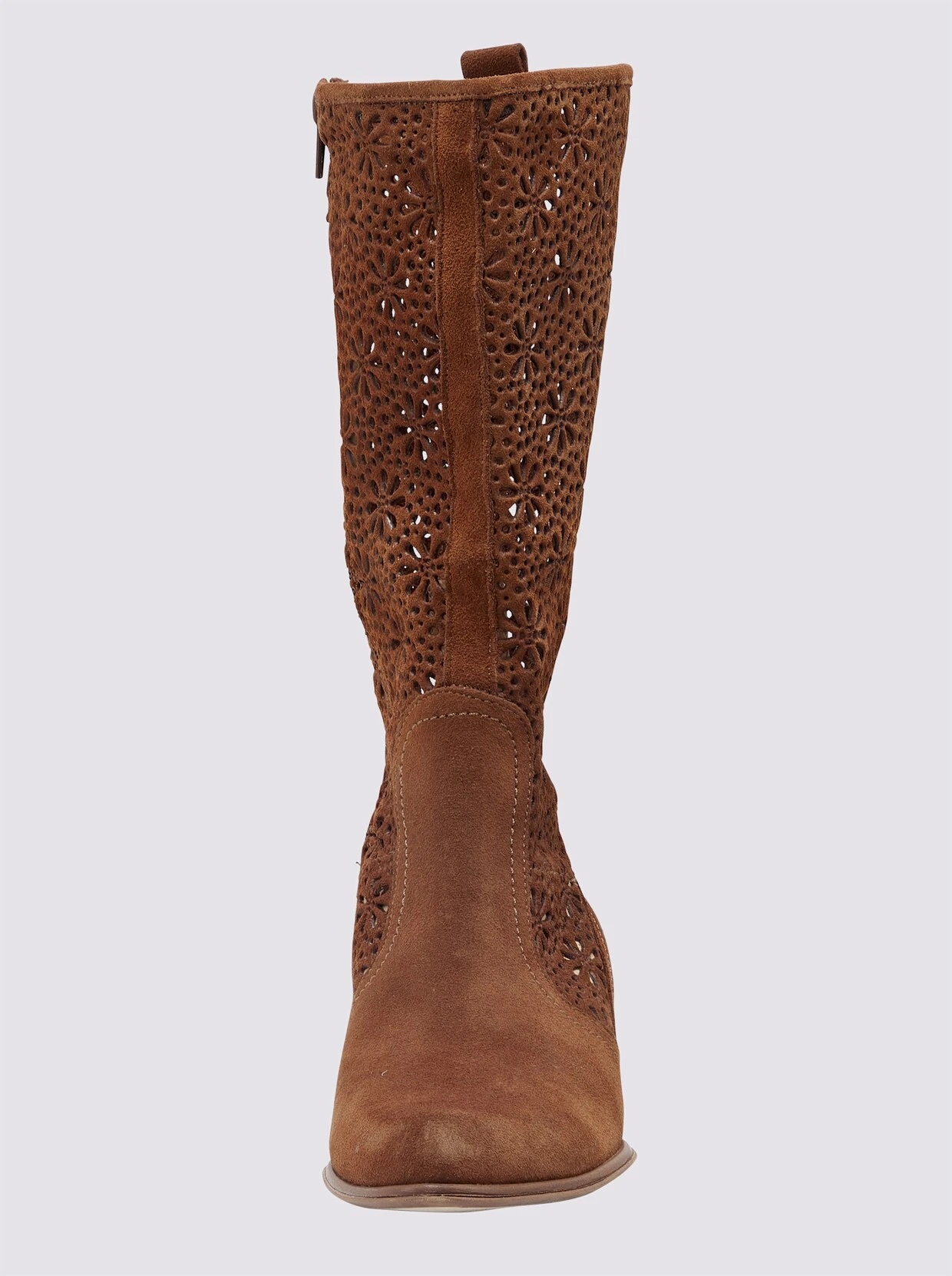 Stiefel Made in Spain. Die perfekte Wahl für warme Tage! Verspielte Cut-Outs in Blumen-Dessin und seitlicher Reißverschluss. Aus softem Rind-Veloursleder. Futter und Innensohle: Leder. Schaft-H/W ca. 31/35 cm. Mit stylischem Cowboyabsatz: Höhe ca. 30 mm.
