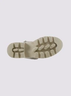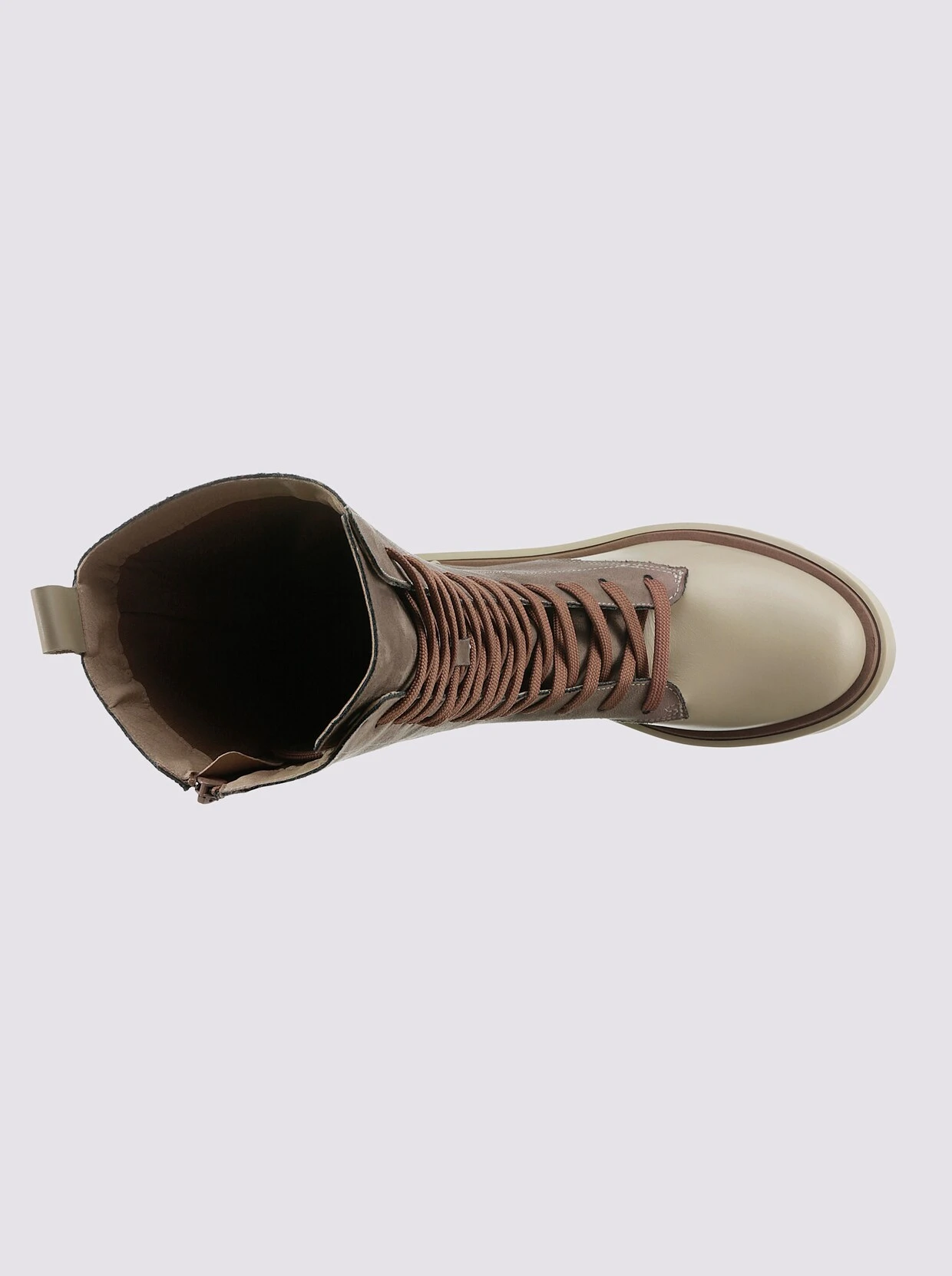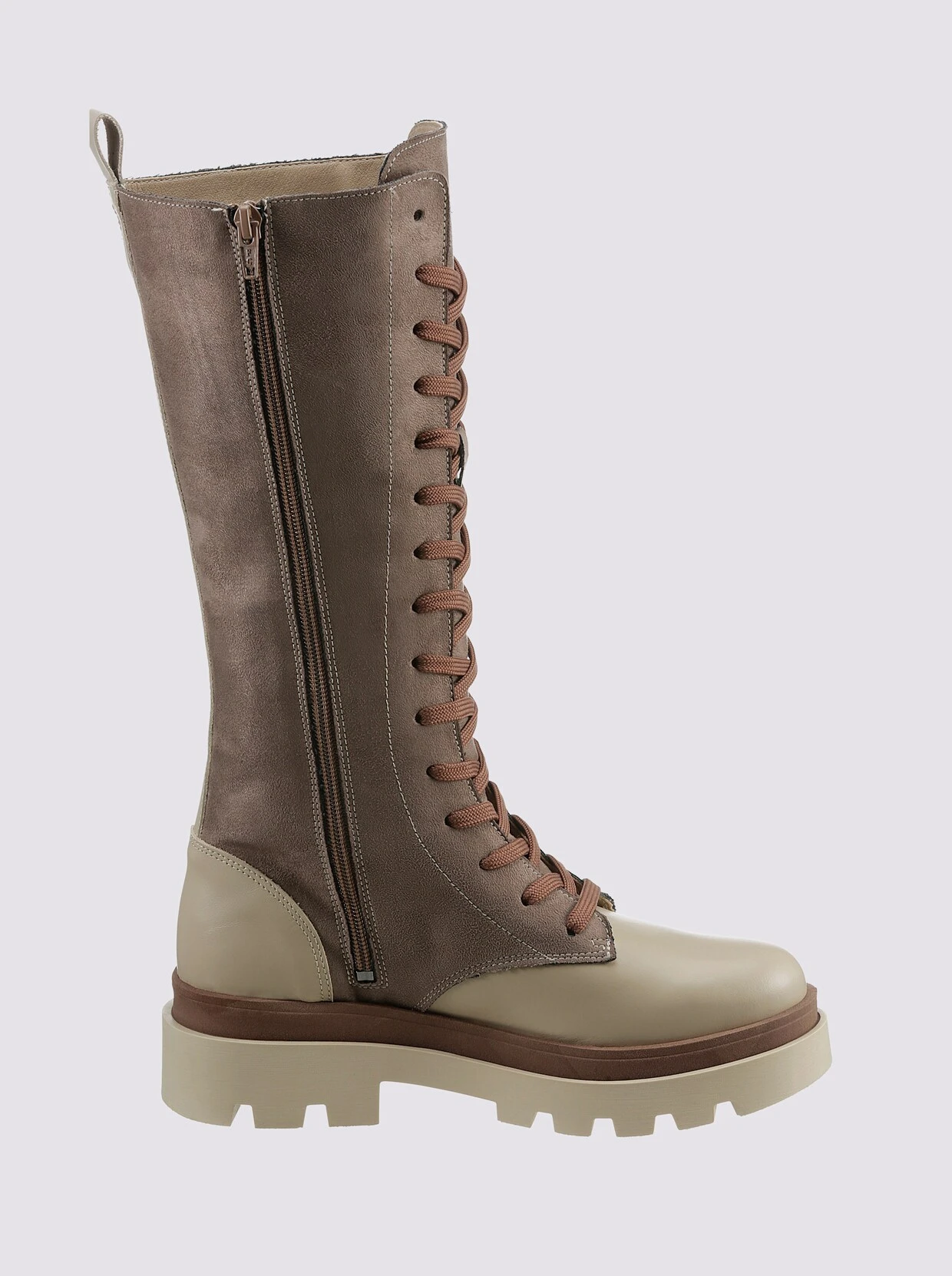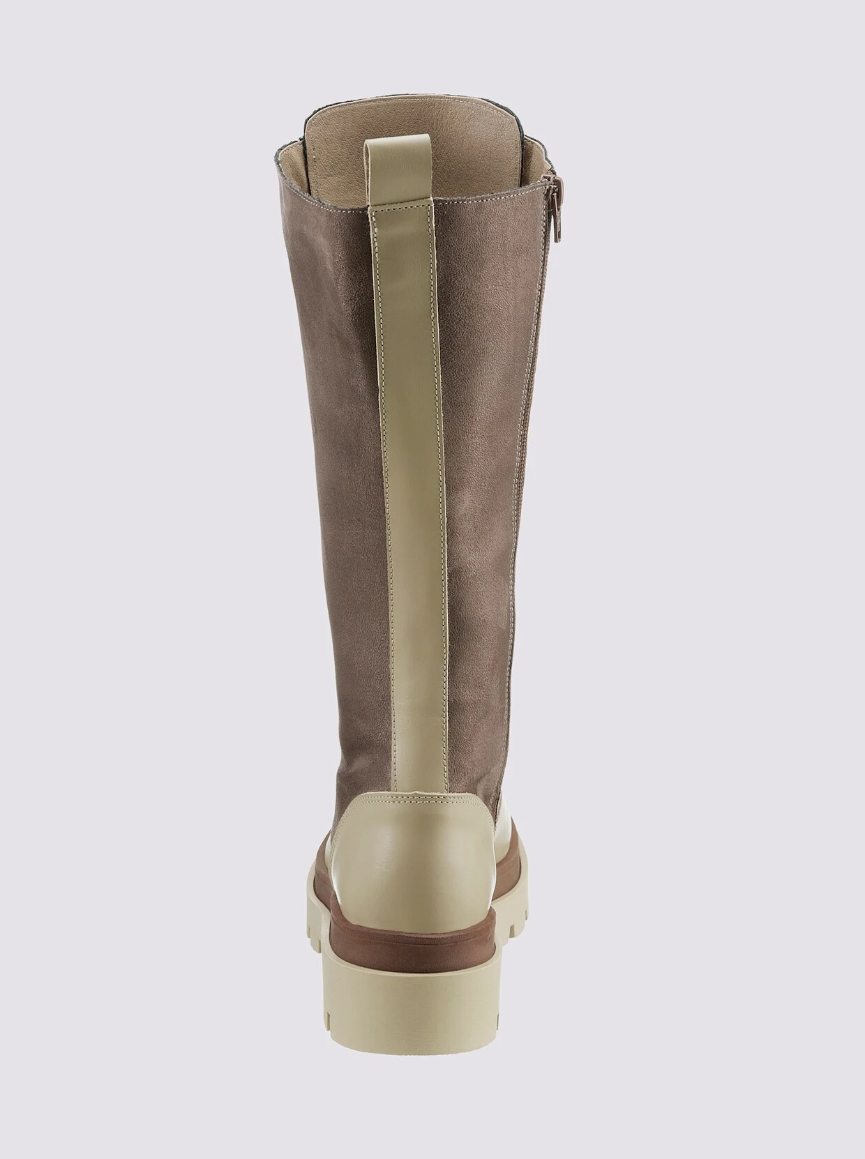Stiefel Made in Portugal. Moderner Trend-Style mit robuster Profilsohle. Taupe-beige aus Microfaser und Rind-Nappaleder, Khaki-schwarz aus Rind-Velours- und -Nappaleder. Mit Reißverschluss. Futter und gepolsterte Innensohle aus antibakteriellem Textil. Plateauhöhe ca. 35 mm. Schafthöhe ca. 27 cm. Blockabsatz, Höhe ca. 50 mm.