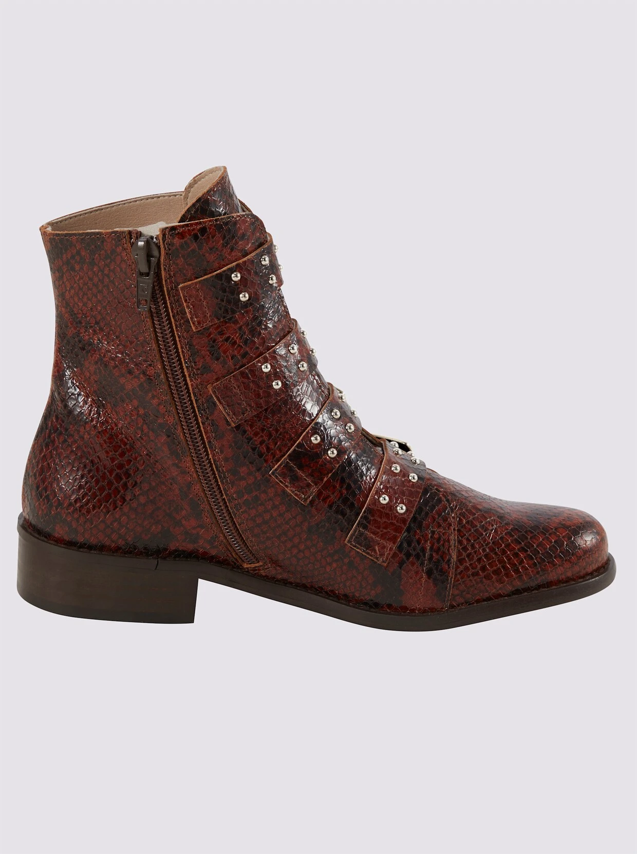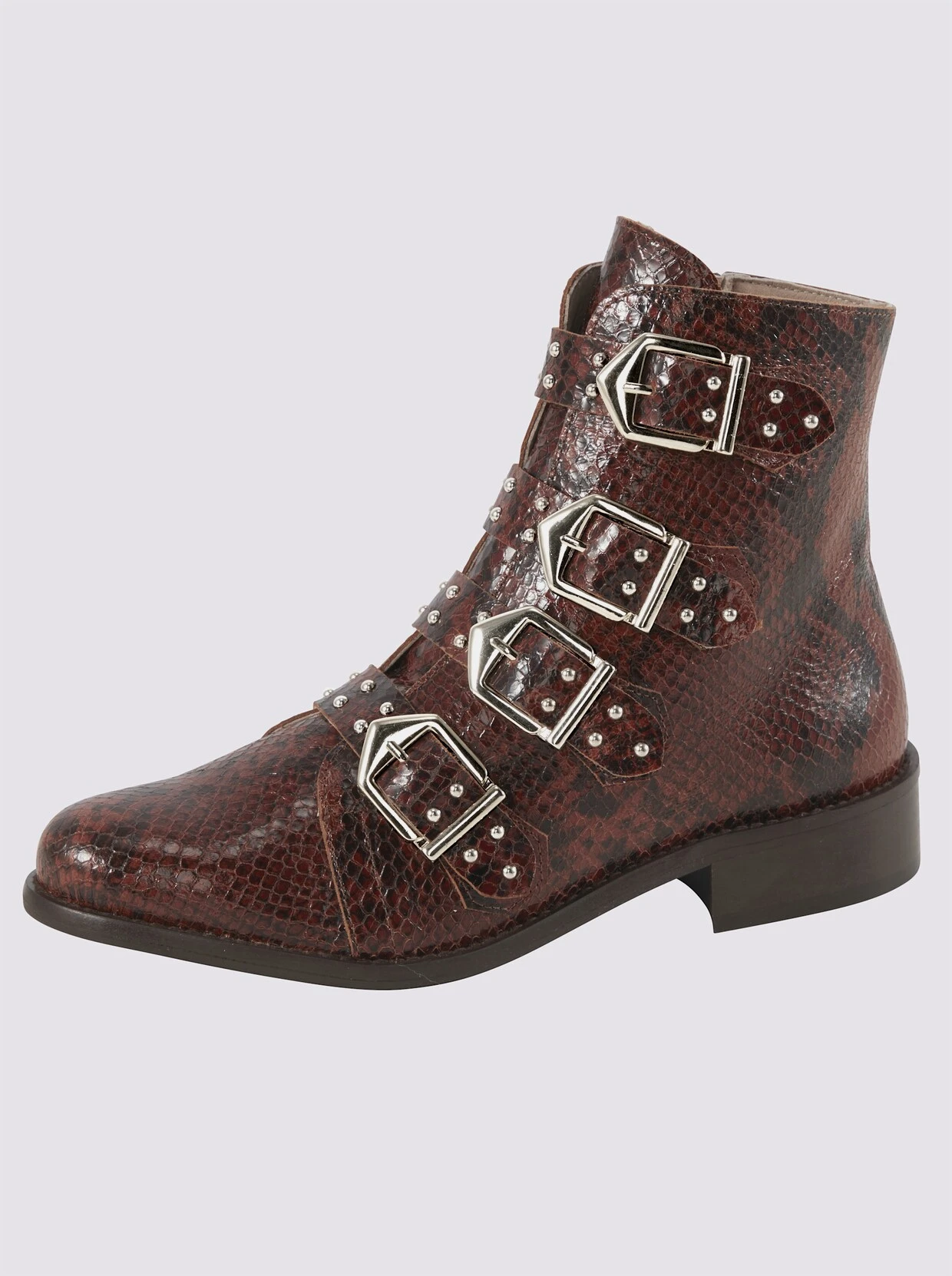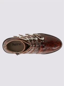 Stiefelette Perfekt gestylt mit großen Schließen und Nieten! Aus hochwertigem Rindleder mit Snake-Print. Mit Innen-Reißverschluss. Futter: Microfaser, Innensohle: Leder. Gummi-Laufsohle. Schafthöhe ca. 15 cm. Absatzhöhe ca. 30 mm.