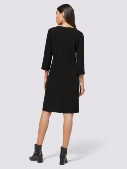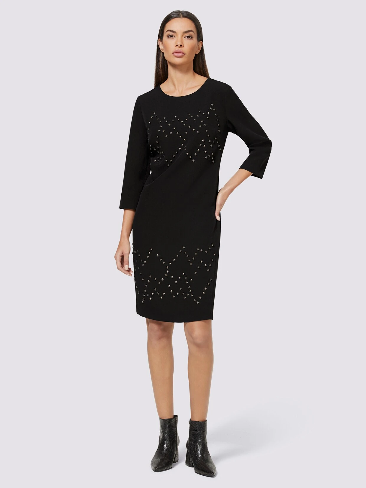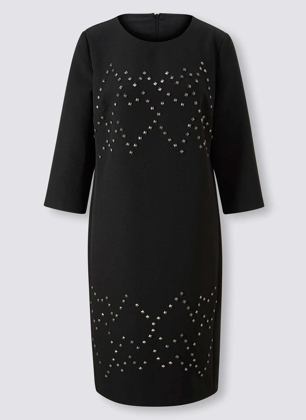 Kleid Topaktuell mit effektvollem Nieten-Besatz! Schwere, formstabile Qualität mit Stretchanteil. Gerade Form mit Rundhalsausschnitt und 3/4-Arm. Nahtfeiner Reißverschluss hinten.