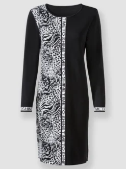 Strickkleid Mit extravagantem Jacquard-Dessin. Halb uni, halb in angesagtem Animal Print mit Schriftzug TIME TO SHINE mittig und am Langarm-Abschluss. Rundhalsausschnitt. Unterstützt die Initiative Cotton made in Africa.
