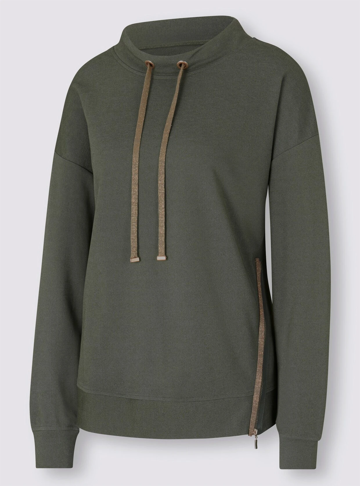 Sweatshirt Sportiver Eyecatcher mit femininen Details: Stehkragen mit Tunnelzug und Bändern aus Effektgarn. Gerade Form mit leicht überschnittener Schulter. Mit dekorativem Zier-Reißverschluss und Bündchen an Ärmeln und Saum.