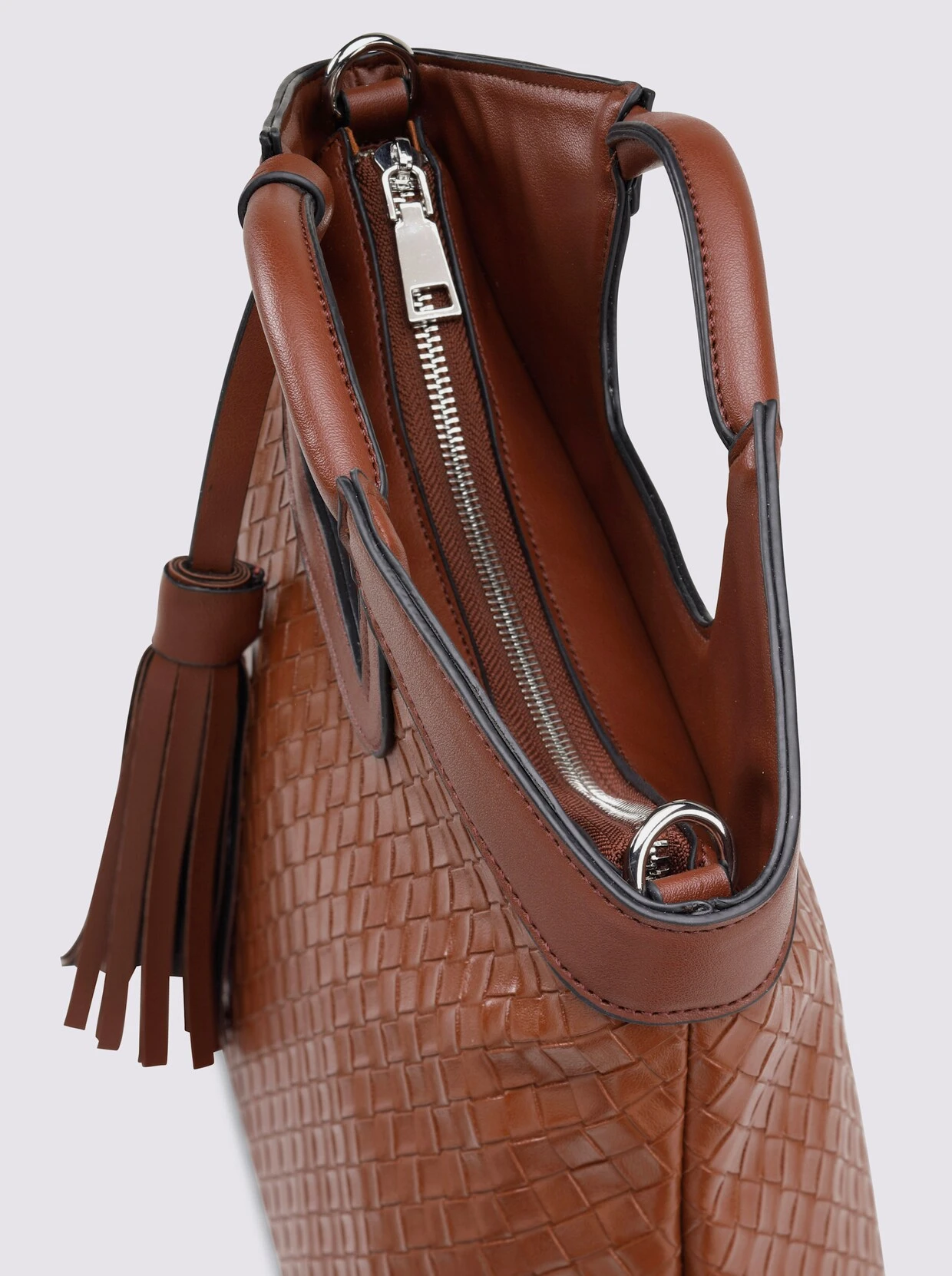 Tasche Kombistarkes Accessoire in edler Flecht-Optik. Aus weichem Lederimitat. Abnehmbare Zierquaste. Abnehmbarer, längenverstellbarer Trageriemen. Innen mit Reißverschluss- und Steckfach. Ca. 30x22x10 cm.