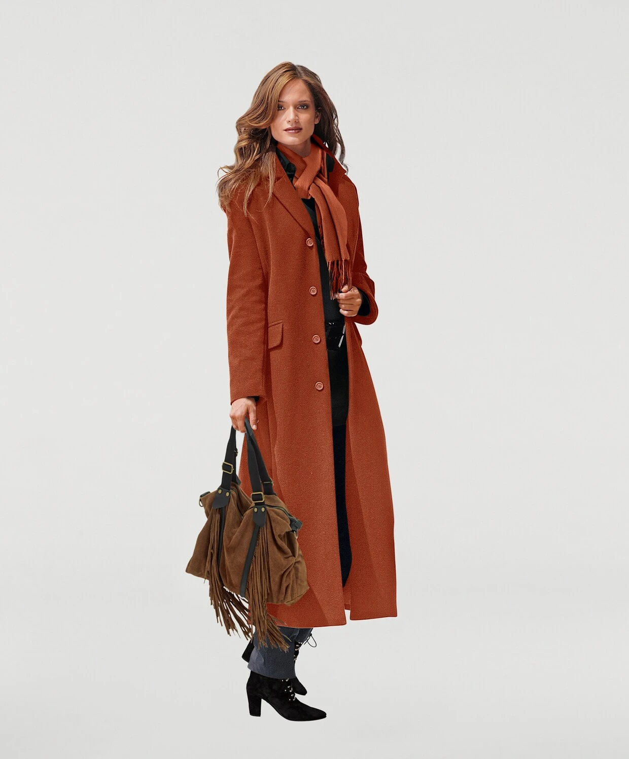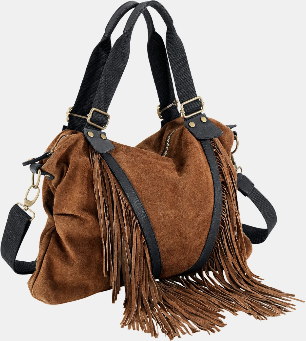 Tasche Mit dekorativen Fransen und zweifarbigem Design. Aus hochwertigem Rind-Veloursleder. Mit Henkeln aus Canvas-Material. Mit abnehmbarem Trageriemen. Ca. 36/46/7 cm.