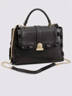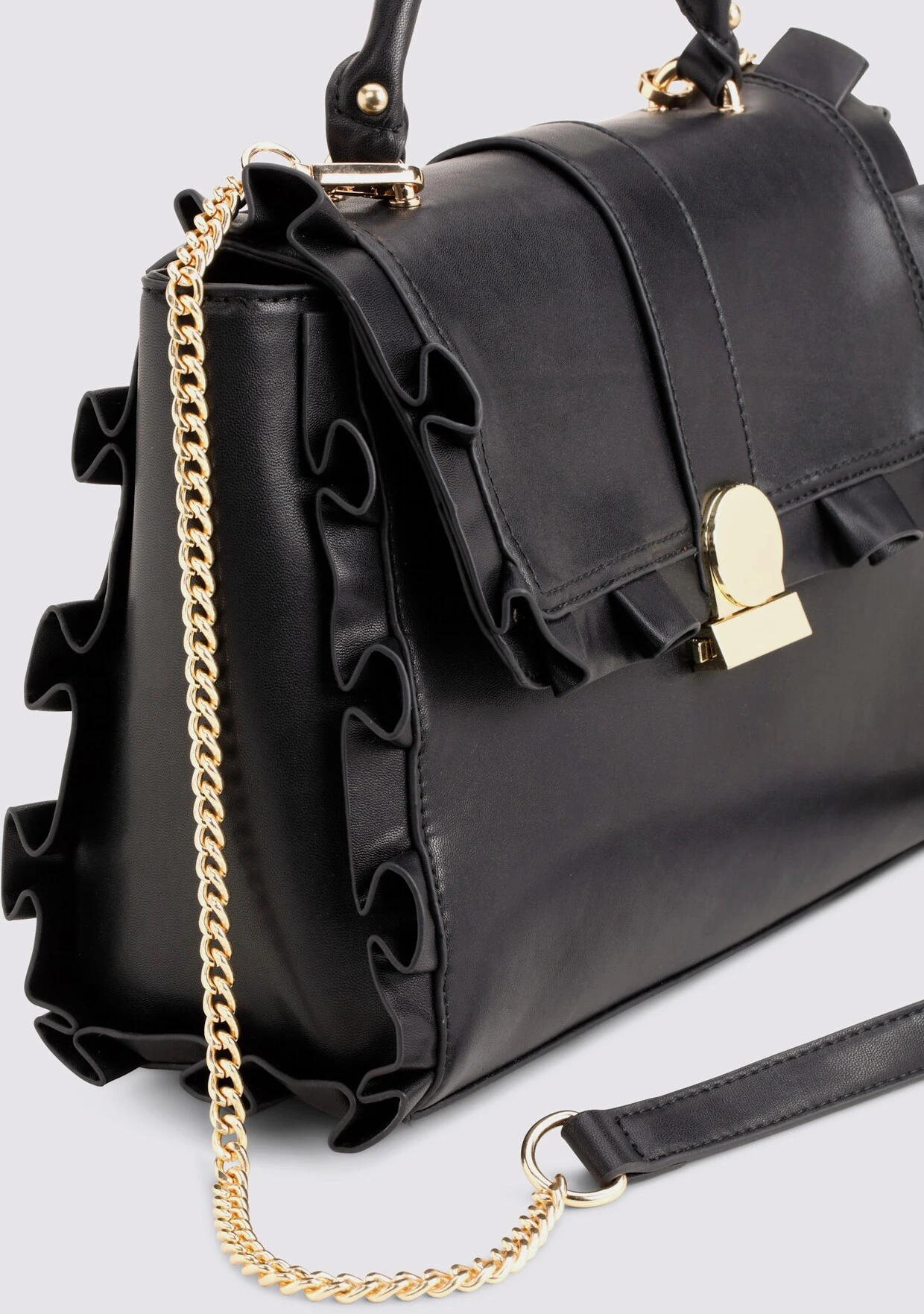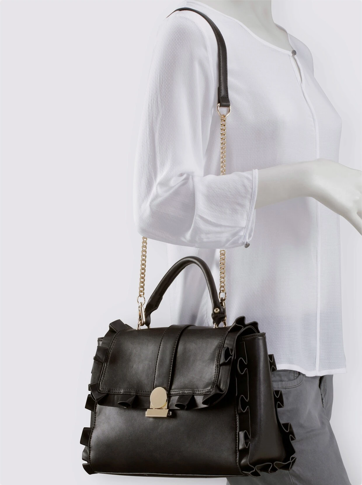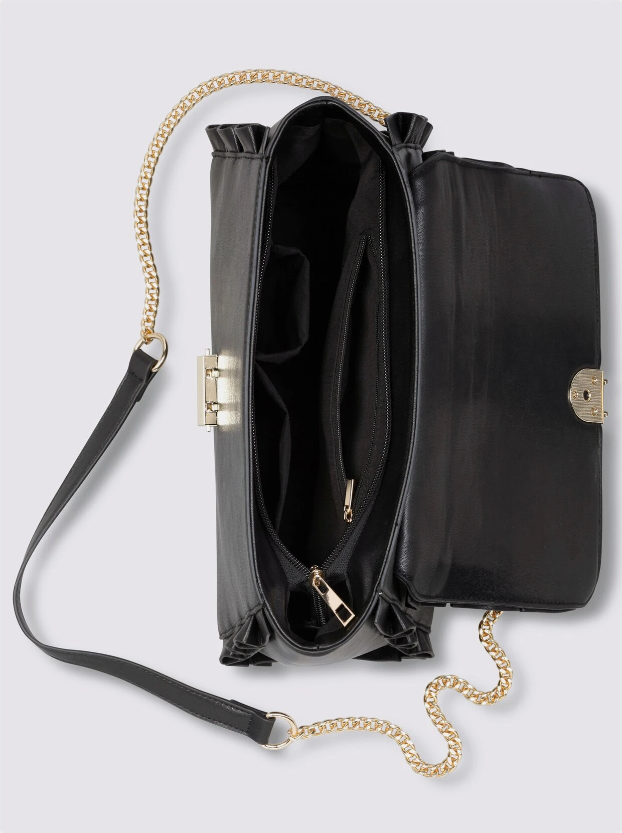 Tasche Kombistarkes Accessoire in Rüschen-Optik und mit goldfarbenen Details. Mit abnehmbarem Schulterriemen. Lederimitat aus hochwertigem Synthetik. Überschlag mit Steckschloss. 1 Reißverschlussfach außen; 2 Steckfächer und 1 Reißverschlussfach innen. Ca. 29/20/11 cm.
