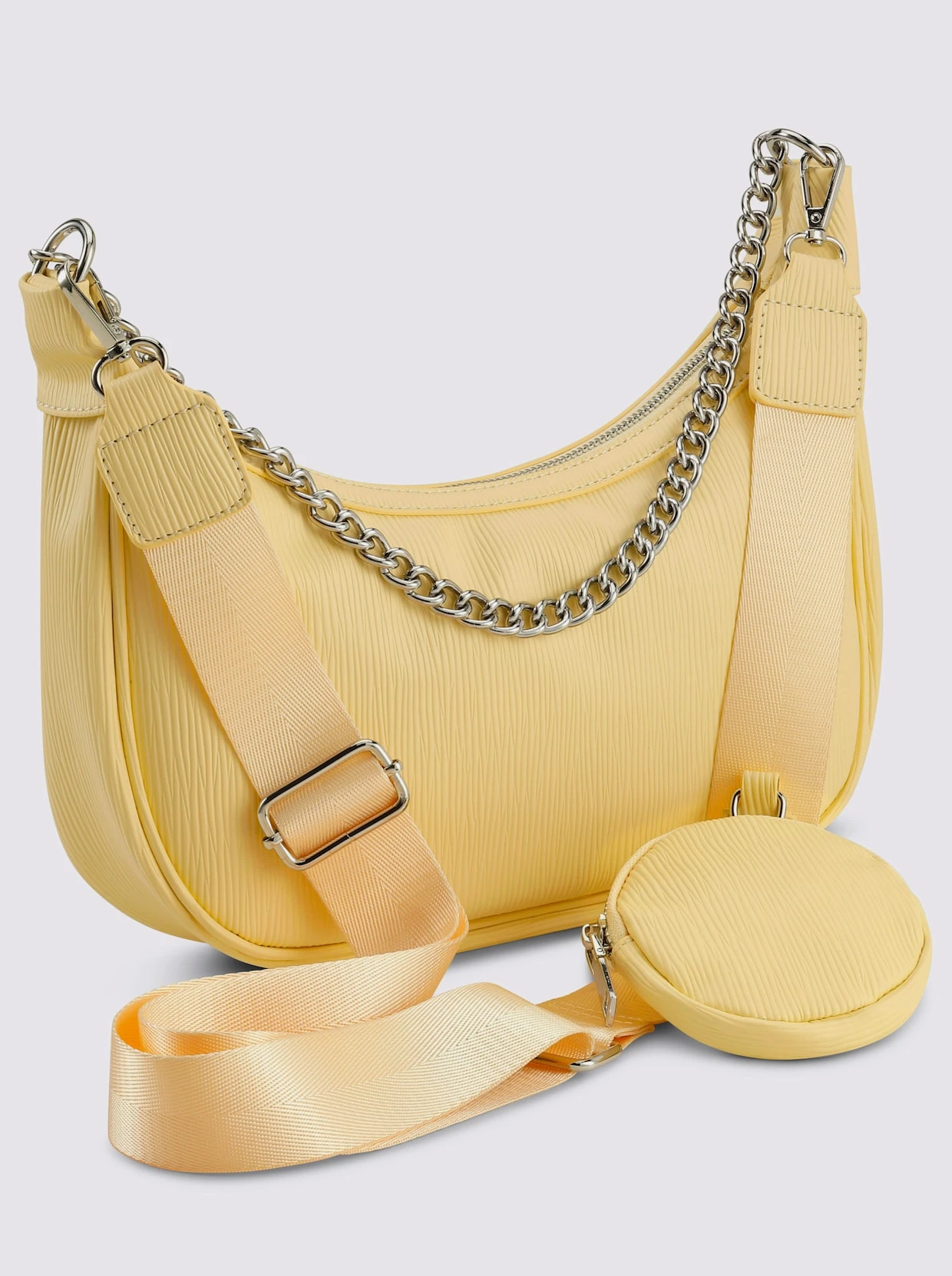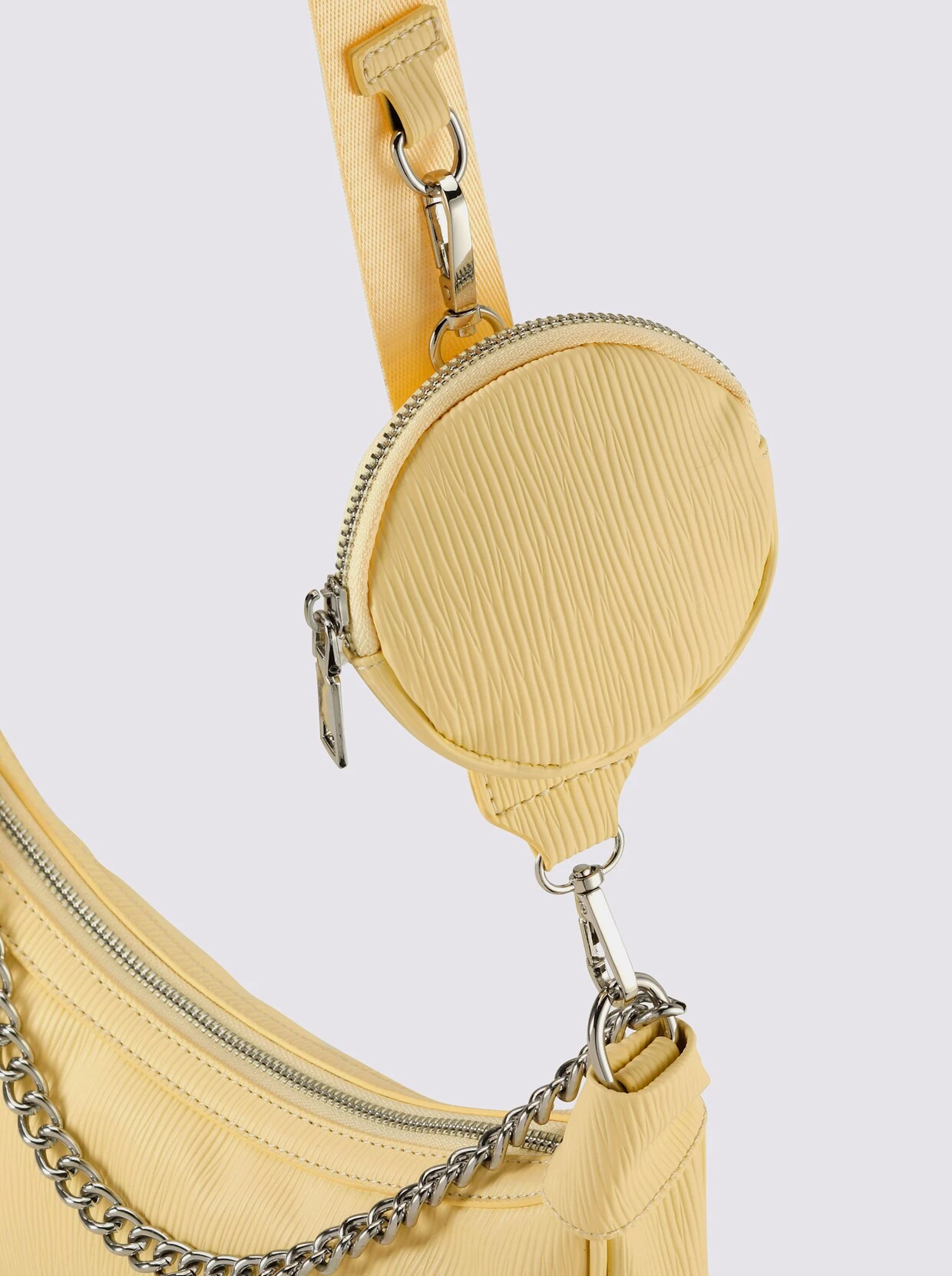 Tasche Mit dekorativer Faltenprägung. Mit kleiner abnehmbarer Tasche am Henkel, Kettendetail und längenverstellbarem abnehmbarem Ripsband. Innen mit Steck- und Reißverschlußfach. Hochwertiges Lederimitat.