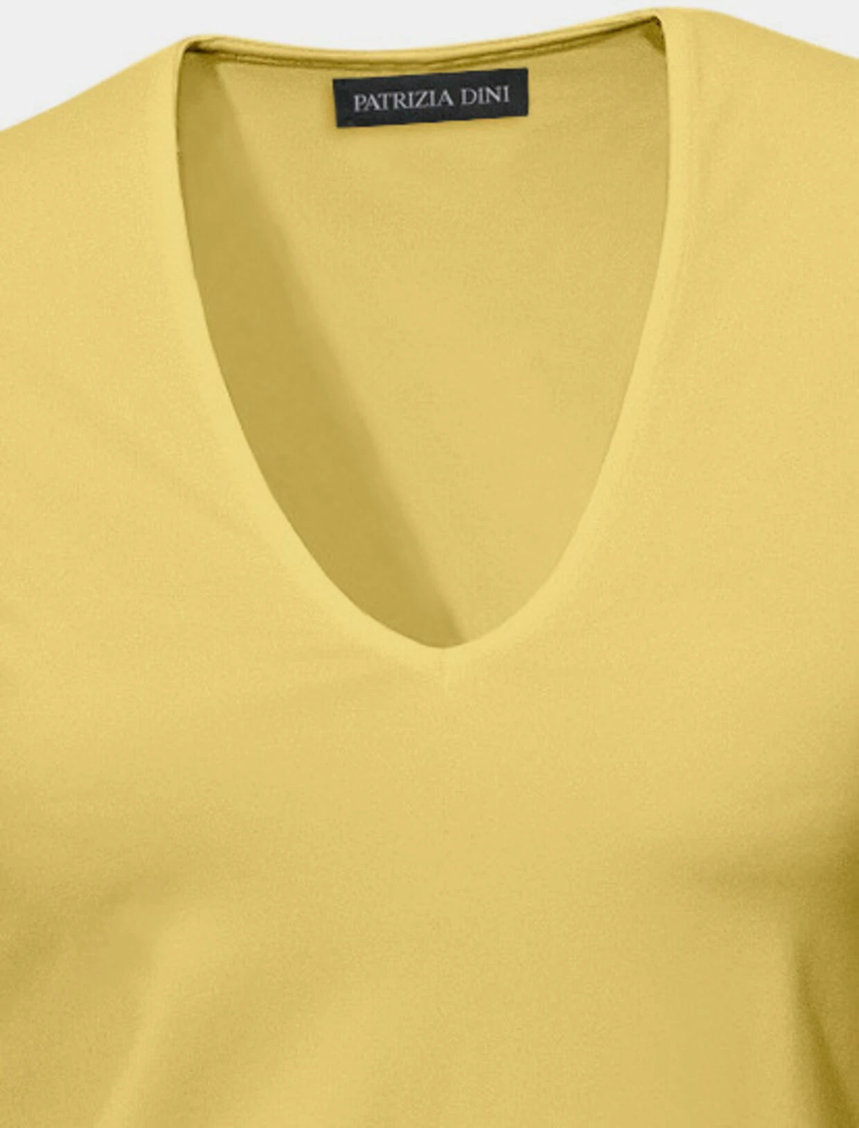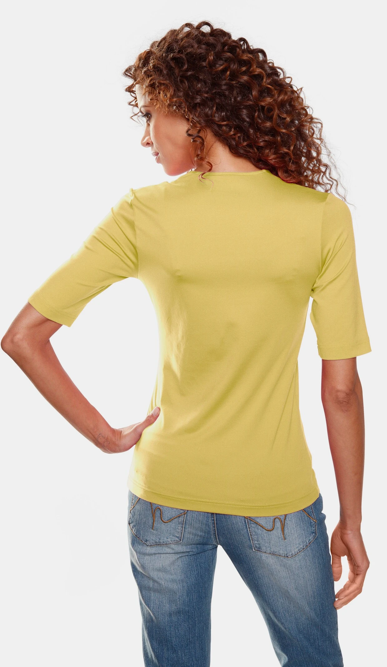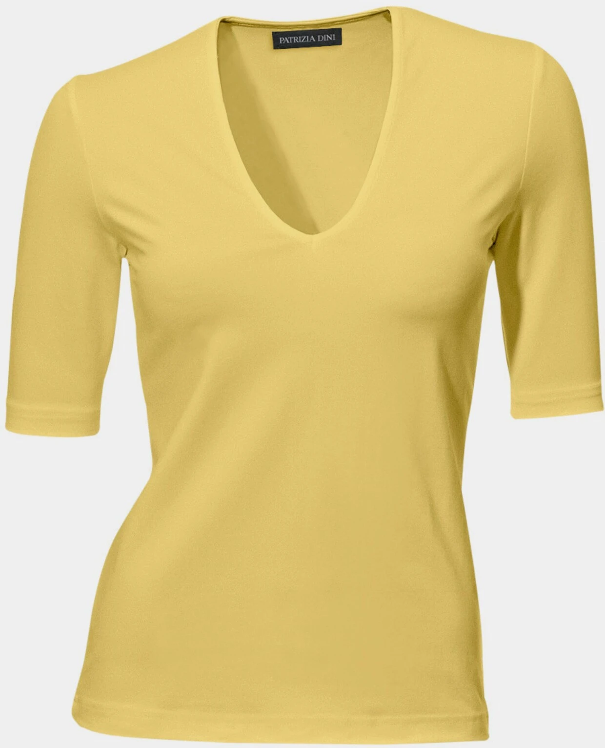 V-Shirt Modisches Basic mit femininem Ausschnitt. Figurbetont, mit etwas längerem Halbarm. Angenehm weiche, farbbrillante Tactel-Qualität mit Stretch-Anteil und leichtem Glanz.