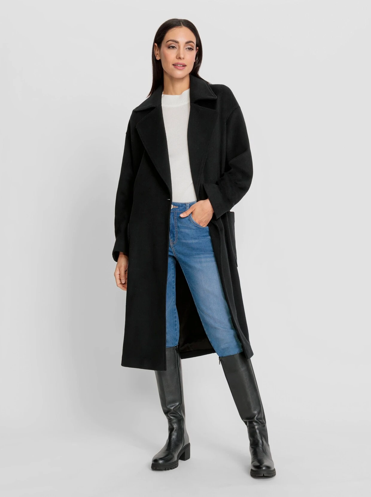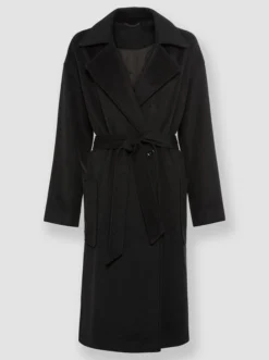 Woll-Mantel Warme, herrlich weiche Qualität mit Wollanteil. Gepflegter Reverskragen und modern überschnittene Schulter. Aufgesetzte Taschen mit Gürtelschlaufen und Bindegürtel. Knopfverschluss.