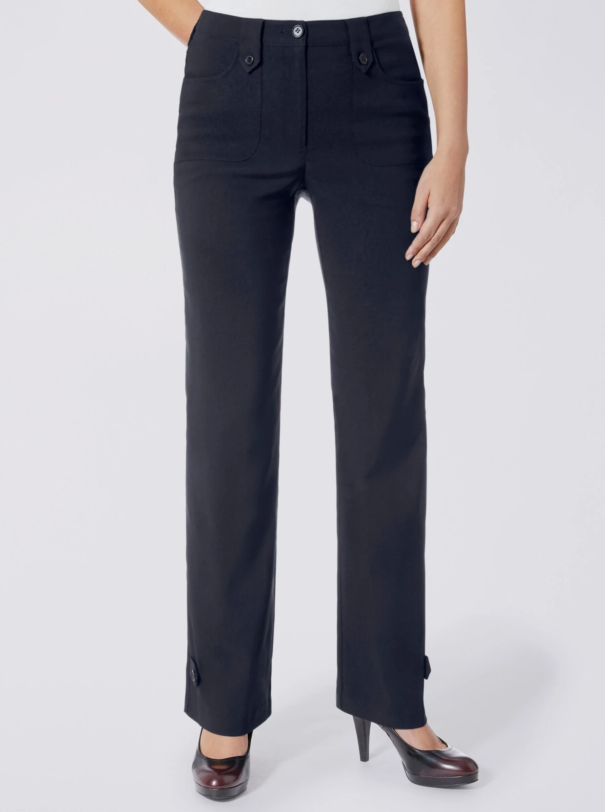Hose – die Stretch-Qualität sorgt für pures Wohlgefühl, die angesagte weite Form modelliert eine Traum-Silhouette. Mit Gürtelschlaufen, Knopf- und verdecktem Reißverschluss vorne, dekorativen Zierriegeln an Bund und Beinabschluss sowie aufgesetzten Taschen im Vorderteil. Fußweite ca. 46 cm.