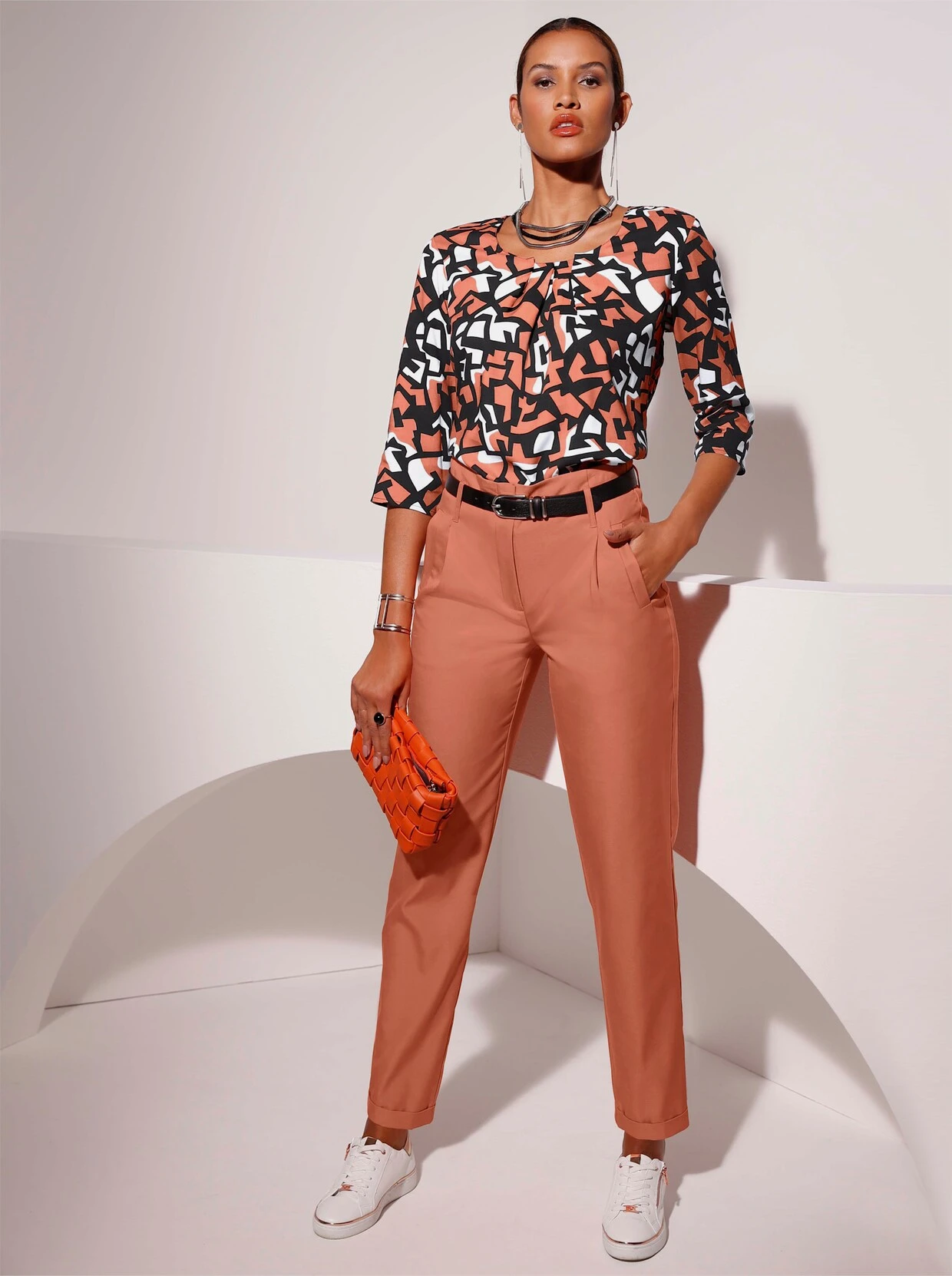 Ein angenehmes Gefühl auf der Haut verspricht diese Hose mit hohem Lyocell-Anteil. Diese Qualität ist bekannt dafür sanft wie Seide zu sein und kühl wie Leinen. Auch gelungen ist der aktuelle Schnitt: taillenhoch, mit Gürtelschlaufen, Haken-, Ösen und Reißverschluss sowie 2 Taschen vorne. Hinten mit 2 imitierten Taschen. Am Saum mit fixiertem Aufschlag. Fußweite ca. 32 cm. Ohne Gürtel.